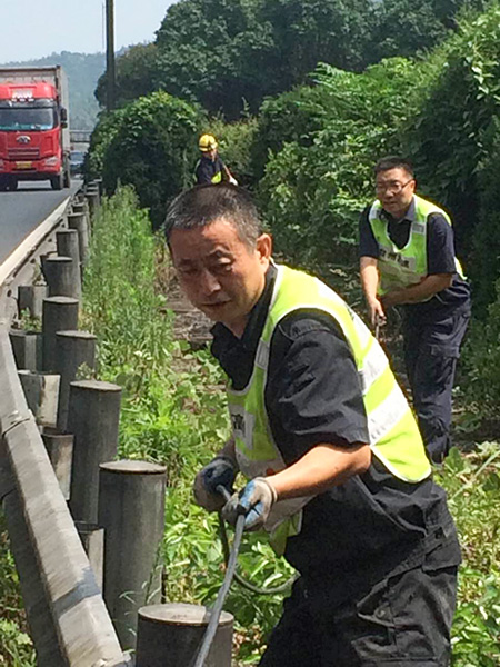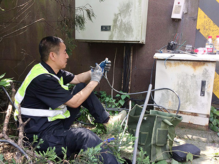 當(dāng)天一早,中心隊(duì)員帶上相應(yīng)的工具和設(shè)備直奔現(xiàn)場(chǎng),在確認(rèn)電纜位置及走向后,便著手抽離洞內(nèi)電纜??紤]到洞口到配電箱電纜至少有100余米,電纜溝下面又鋪有其他眾多電纜以及之前掉落的垃圾,直接從洞口抽離根本無(wú)法動(dòng)彈。于是,中心4名隊(duì)員便每隔10米左右用撬棍撬開(kāi)上面水泥蓋板,整個(gè)人跳進(jìn)電纜溝內(nèi),彎著腰一段一段抽離。抽到最后一個(gè)溝時(shí),4人頂著烈日,齊力把重達(dá)近百斤電纜抽離整個(gè)電纜溝并放置在護(hù)欄內(nèi)側(cè)草地上,隨后再?gòu)某槌龅倪@段電纜中剪取適當(dāng)長(zhǎng)度,重新鋪設(shè)后與寧向出洞口的情報(bào)板電纜相接。