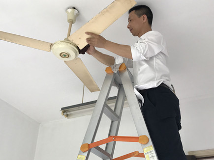 圖為工作人員在擦洗電扇