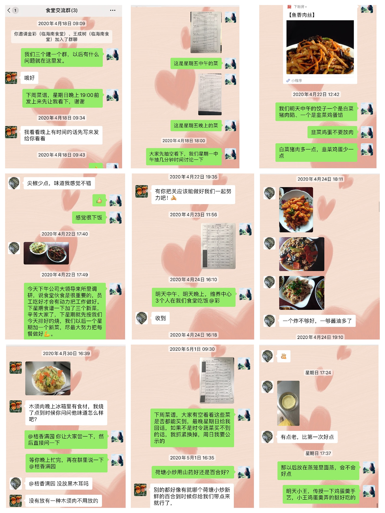 今年4月中旬,所務陳瑩利用微信建立了食堂交流群,經(jīng)常在群里上傳網(wǎng)上、廚房APP下載的一些簡單又美味的家常菜制作方法。結合食堂人員的特長,針對季節(jié)變換,合理調整飲食,做到葷素搭配、飯菜每班一日三餐不重樣等要求,提前列出每周菜譜,要求食堂人員根據(jù)菜譜,每周針對創(chuàng)新家常菜,提前準備少量食材,精心燒制,待嘗試滿意后供應。