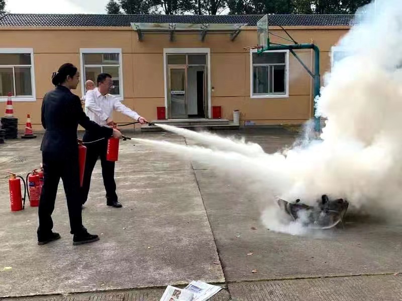 圖為滅火器演練現(xiàn)場 演練現(xiàn)場,老員工們按照“一看二搖三拔四噴”的使用方法,熟練地檢查了滅火器有無過期,隨后搖動(dòng)瓶身、拔出插銷,對(duì)著火源根部噴了下去,熊熊火勢瞬間被熄滅。
