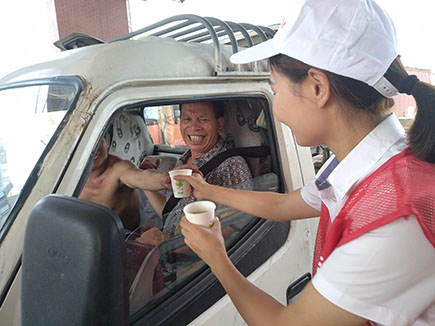 圖為志愿者給養(yǎng)護(hù)工人送上綠豆湯