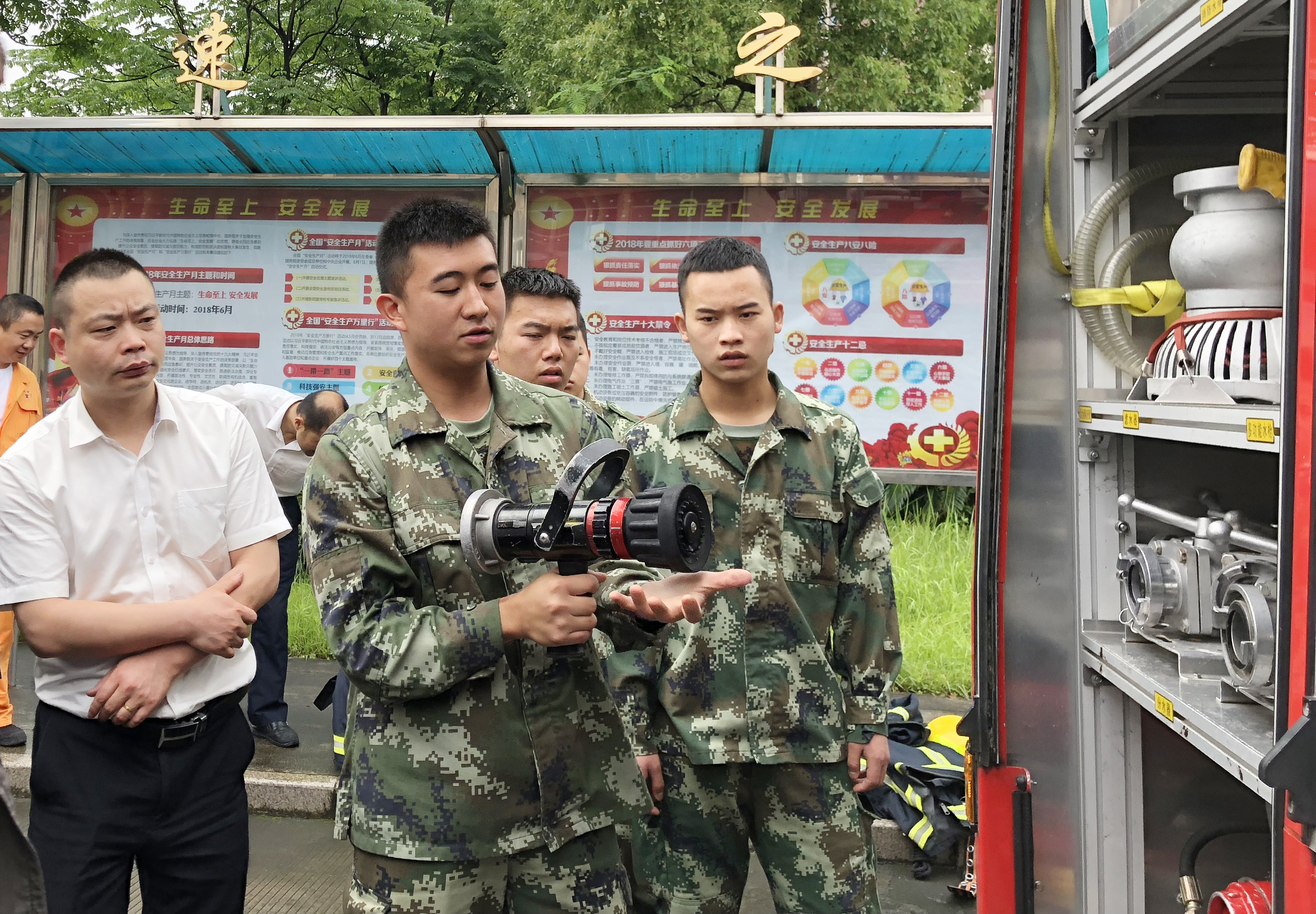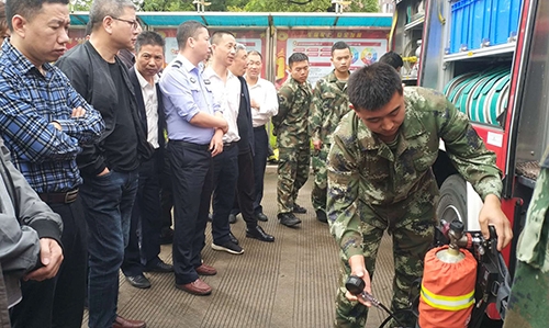 圖為培訓(xùn)現(xiàn)場 活動現(xiàn)場,黃巖消防大隊官兵向參加活動的員工展示消防車上的消防裝備實物,講解裝備使用功能以及消防車基本構(gòu)造,耐心地解答員工提出的問題,并當(dāng)場進(jìn)行專業(yè)的消防水帶連接滅火演示。之后,臺州收費所員工開展消防水帶連接滅火演練,獲得黃巖消防大隊官兵的肯定,同時針對演練中存在的問題及不足給出專業(yè)性的指導(dǎo)意見。