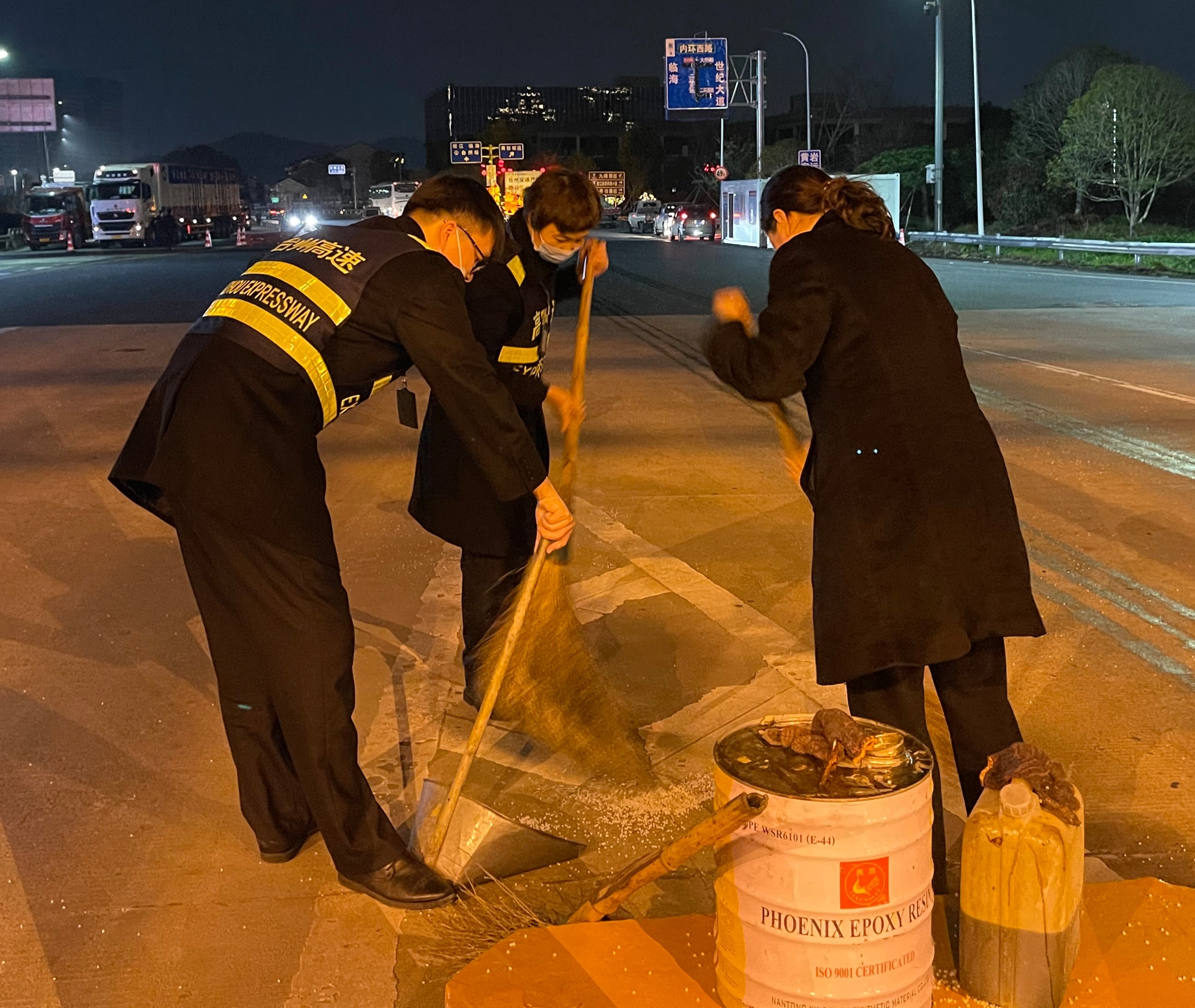 (圖為工作人員在清掃) 一時(shí)之間,車道路面上落滿大量的塑料顆粒,考慮到夜色已深,ETC車道上行駛的車輛速度大多很快,萬一司機(jī)沒有及時(shí)發(fā)現(xiàn)前方道路上的灑落物,極易造成輪胎打滑,嚴(yán)重影響行車安全。情況緊急,為了后續(xù)通行車輛的安全,收費(fèi)班長立刻關(guān)閉了該ETC車道,并放置警示標(biāo)志,然后將這一情況上報(bào)給監(jiān)控中心和收費(fèi)所值班人員。不等清潔人員到來,收費(fèi)員羅時(shí)杰從車道的工具房拿出掃帚和簸箕,主動(dòng)開始清掃工作。隨后其他不坐崗的收費(fèi)員也投入到了清掃工作中,這支臨時(shí)清掃小隊(duì)在沒有任何人的領(lǐng)導(dǎo)下自發(fā)地組織起來。這時(shí),從高速上完成機(jī)電養(yǎng)護(hù)工作的機(jī)電班工作人員正巧路過,他們看到這一幕立刻將車停靠在一邊,加入清掃隊(duì)伍。盡管散落的塑料顆粒數(shù)量較多,但在大家的共同努力下,車道終于被清理干凈,恢復(fù)了正常通車。 春日的夜晚微風(fēng)拂過,已有春的暖意,而更暖的是這一幕在春夜里的一個(gè)個(gè)身影。大家因?yàn)橐患∈露墼谝黄穑欢踩珶o小事。所有人心系安全,為所有過往車輛保暢保安全,為臺(tái)州高速貢獻(xiàn)自己的一份力。 崔翔浩 吳侃霓
