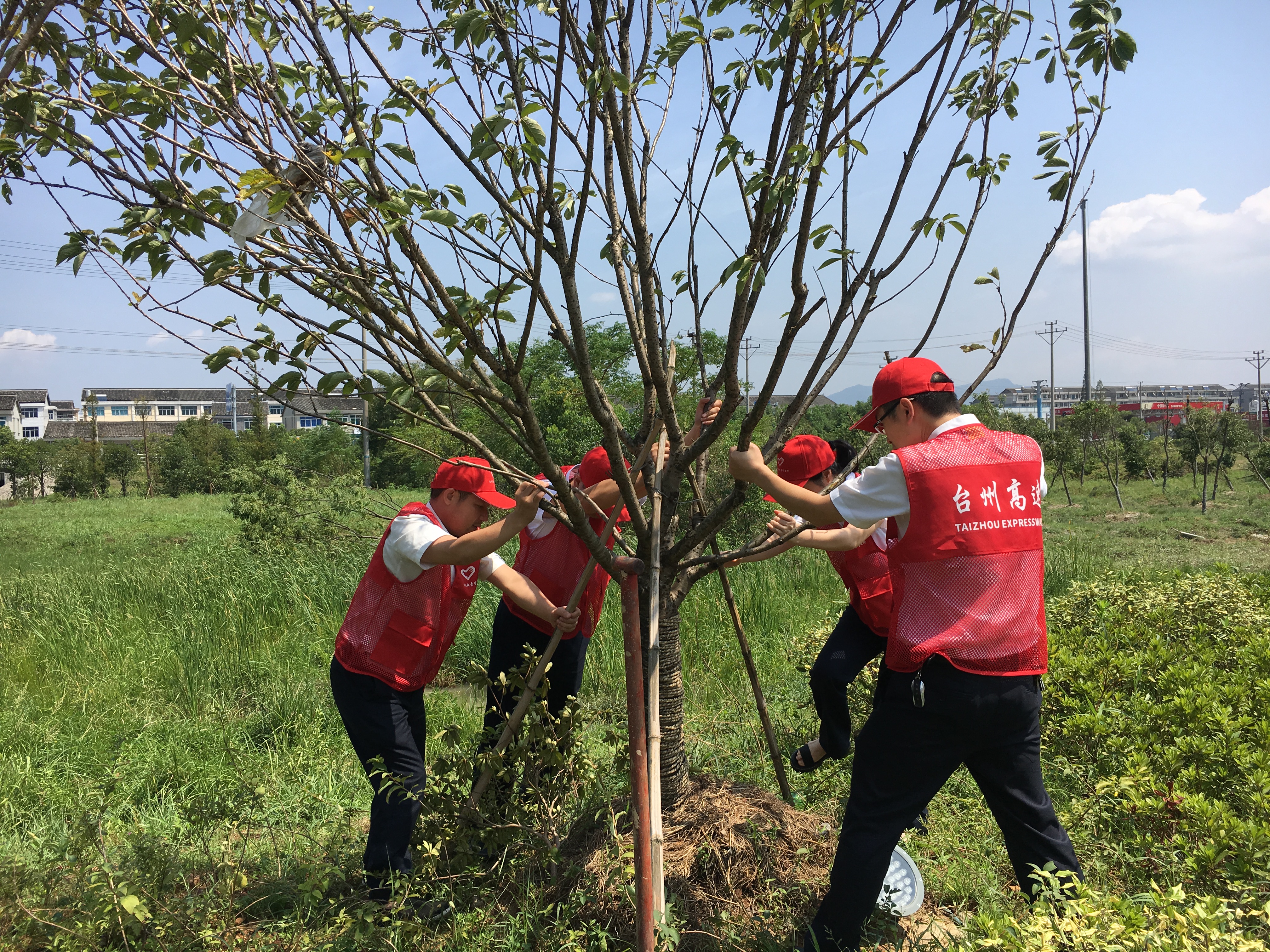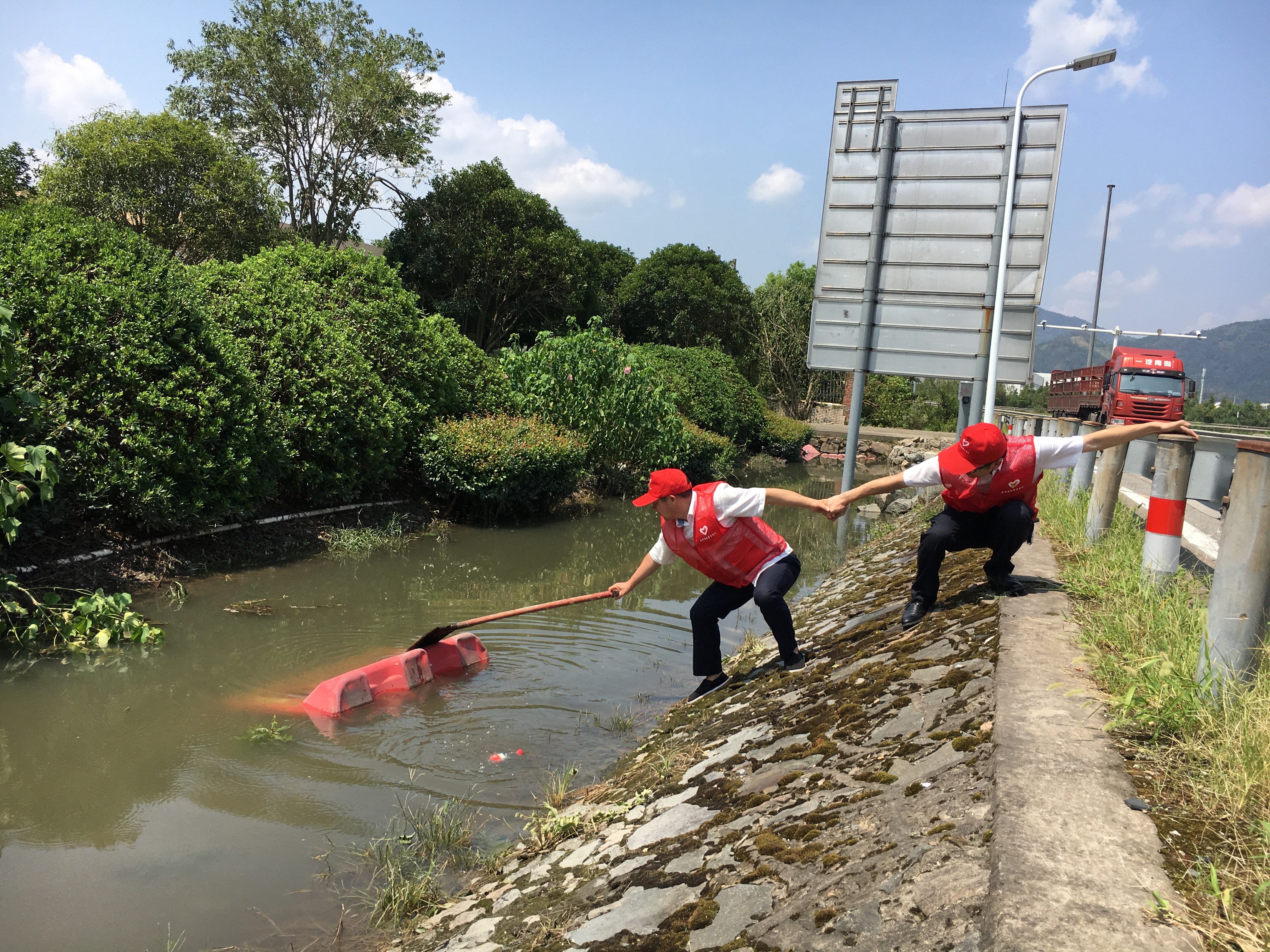 圖為志愿服務(wù)現(xiàn)場 隔離護欄被風(fēng)吹歪的,將其扶正,并作簡單的固定;綠化帶好多樹被連根拔起,找來撐桿、繩子進行加固;斷枝殘葉滿地都是,就用手撿,用掃把掃,集中堆放倒伏的斷枝;清掃路上的垃圾;清除路障;打撈被風(fēng)吹入邊溝的水馬;對收費區(qū)域的衛(wèi)生來了一次大清理…… 臺風(fēng)后氣溫升高,空氣濕度大,天氣異常悶熱,志愿者們揮汗如雨,一個個臉被曬得通紅,他們卻沒有因此放下手中的工具,停滯清理的步伐,迎“熱”而上,為災(zāi)后的恢復(fù)貢獻自己的力量,用行動踐行初心和使命。 夏蓮萍