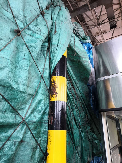 圖為篷布纏繞防撞柱 在與司機溝通后,工作人員用剪刀剪開篷布及尼龍網,司機和陳軍用工具頂住貨物防止貨物墜落。經過近20分鐘的努力,終于將篷布與防撞柱分離。 在此,筆者提醒各位貨車司機,出發(fā)前一定要仔細檢查車上綁扎物是否扎緊,避免因自身疏忽造成不必要的損失。 洪燈杰