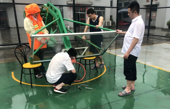 圖為所負(fù)責(zé)人帶領(lǐng)人員拆卸籃球架 此前,溫嶺西已經(jīng)做好基礎(chǔ)的抗臺(tái)防范工作,關(guān)閉所內(nèi)各寢室、辦公室門窗,提前裝好沙袋備用,準(zhǔn)備好抗臺(tái)物資及近幾天的餐食,確保所內(nèi)各項(xiàng)事務(wù)正常運(yùn)行。8月9日上午,該所長(zhǎng)、副所長(zhǎng)在臺(tái)風(fēng)前做最后一次細(xì)致的排查,三人還親自動(dòng)手將陽(yáng)光房的窗戶都卸下來,避免風(fēng)力太大,玻璃破裂,造成安全隱患。此外,為預(yù)防操場(chǎng)籃球架承受不住巨大風(fēng)力,將籃球框拆卸下來,把籃球架放倒。其后通知所內(nèi)開車的人員將所有車輛停入操場(chǎng)中,以防止周邊樹木被風(fēng)刮斷,造成車輛損失。 林夢(mèng)灑