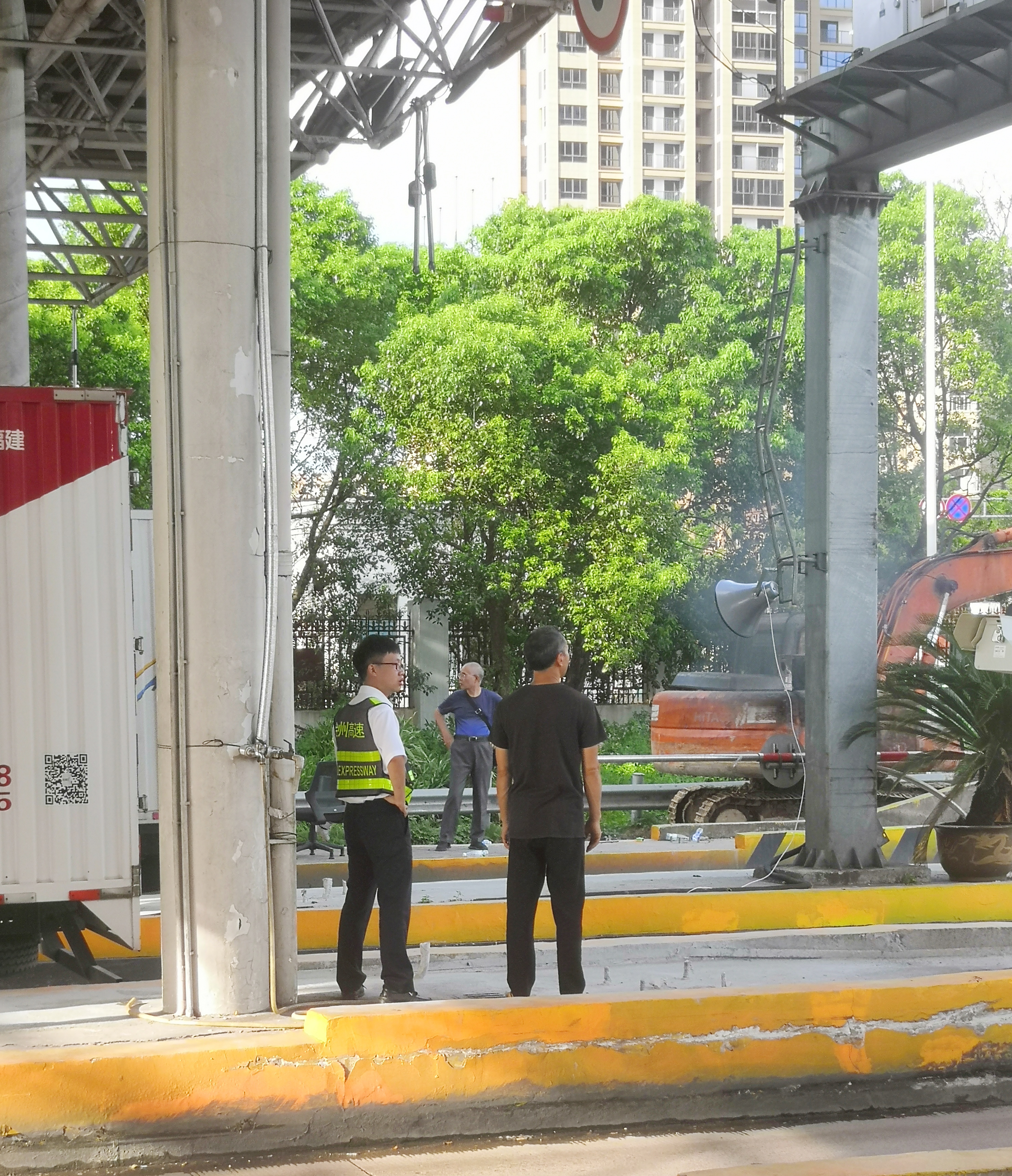 圖為收費員幫忙在車道蹲守 弄明白事情原委后,收費員立即把情況反應給了班長和治安崗亭的駐勤人員,同時安撫他們不要著急,提醒他們馬上報警。而后,工作人員陪同他們在入口處蹲守了半小時。最終,兩名男子對工作人員進行了感謝,表示接到家人和警方的電話,隨即匆匆離去。 在此提醒大家,遇到緊急情況要沉著冷靜,要第一時間選擇報警,切勿自己盲目行動。同時高速公路禁止行人、非機動車駛?cè)?,禁止無關(guān)人員在收費站周邊逗留,以免發(fā)生安全事故。 洪燈杰