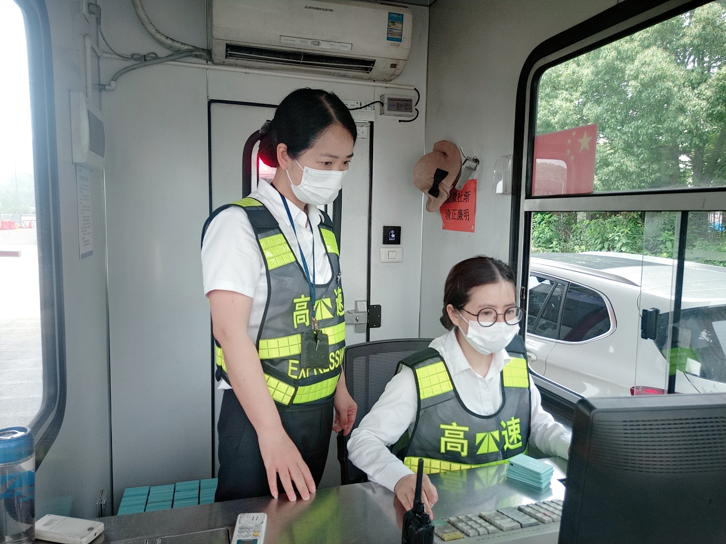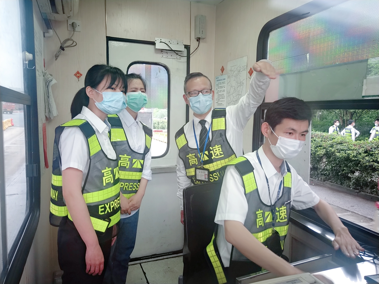 圖為陳軍帶領(lǐng)新員工在崗?fù)づ嘤?xùn) 新員工的到來,為該所注入了新鮮的血液,增添了青春活力。為了讓新員工能夠快速“入鄉(xiāng)隨俗”,盡快適應(yīng)收費站工作環(huán)境,順利完成角色轉(zhuǎn)換,當(dāng)日他們就跟著資深班長陳軍學(xué)習(xí)相關(guān)業(yè)務(wù)知識。