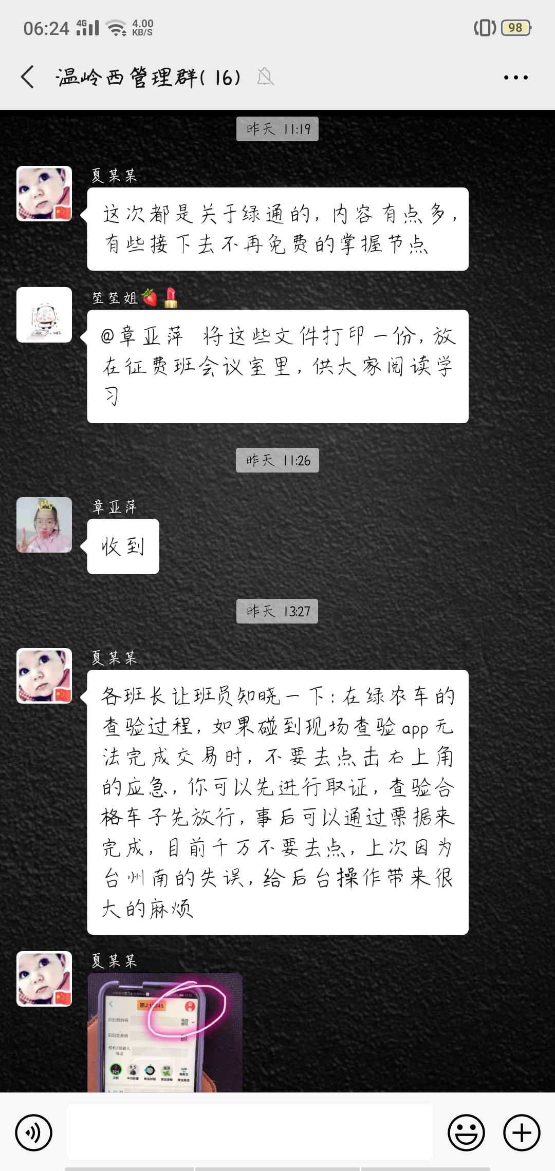 培訓采取集中學習與線上學習相結(jié)合,理論知識與現(xiàn)場操作相結(jié)合、互動交流與相互提問相結(jié)合的方式開展,通過釘釘、微信等學習平臺,天,各班班長組織班員開展崗前五分鐘提醒、班組集中學確保每一名收費人員能夠熟練掌握新收費系統(tǒng)的各項操作流程。此外,各班班長及時梳理匯總收費員們在實際操作中遇到的問題,并上傳至管理群群中全員參與,一起討論學習。遇到無法解決的問題時,所負責人第一時間與上級主管部門溝通尋求最佳解決方案,并發(fā)布到群里,明確操作流程和統(tǒng)一相關(guān)政策解釋工作。
