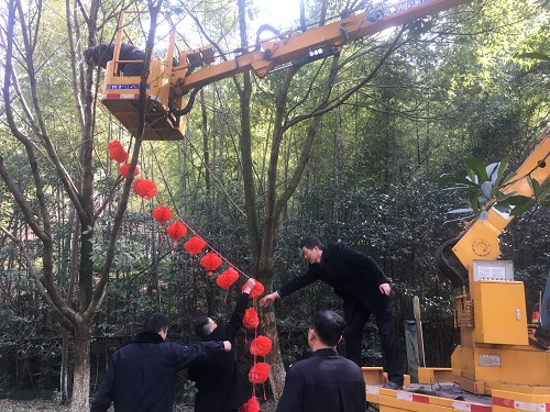 過年掛燈籠是中國古老習(xí)俗,紅色代表喜慶,圓形燈籠寓意團圓美滿。該所工作人員利用午休時間自制大紅燈籠750盞,并拿線連成串,大家借來登高車將燈籠掛在綠蔭道兩旁以及公路下方車輛經(jīng)過的地方。遠(yuǎn)觀這掛好的燈籠,一片紅火,形成春節(jié)期間一道亮麗的風(fēng)景線。