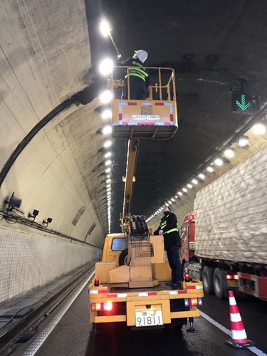 圖為執(zhí)勤隊在擦拭燈具 原定3月27日的黃土嶺溫向隧道清洗計劃由于天氣原因順延,28日上午,所領導正為隧道能否清洗而發(fā)愁, 9點58分只見天空放晴,外面?zhèn)鱽眇B(yǎng)護車警笛聲,養(yǎng)護封道開始。患著嚴重感冒的李莉拖著疲憊的身子早早準備好一切清洗必需品。 “洪瑞、程常你們一組,一個用餐巾紙擦拭攝像機鏡頭、一個用毛刷刷LED燈具表面,這樣可以節(jié)約時間?!标犻L叮囑道。 執(zhí)勤隊有條不紊地開展隧道清洗工作,他們快速地擦拭隧道內(nèi)每個設備,仔細地檢查每個消防、機電設施。