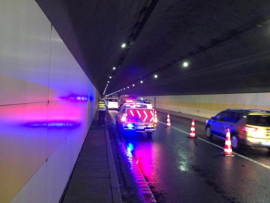執(zhí)勤隊迅速出警,幾分鐘后就趕赴事故現(xiàn)場,發(fā)現(xiàn)一輛白色面包車撞隧道內(nèi)右側(cè),車輪箍嚴(yán)重受損,卡在護(hù)溝里,所幸無人員受傷。執(zhí)勤隊進(jìn)行提前預(yù)警,預(yù)防二次事故的發(fā)生,并呼叫高速施救車輛支援,幾分鐘后施救車抵達(dá),事故車輛安全拖離隧道,僅僅十分鐘,交通就恢復(fù)暢通。