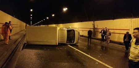 事后經了解,因當天小雨,路面濕滑,該小貨車在剛進隧道不久,司機發(fā)現(xiàn)跟車太近,急踩腳剎車,致使小貨車不受控制地翻車,并導致油箱漏油。所幸該事故并未造成人員傷亡和較大損失。