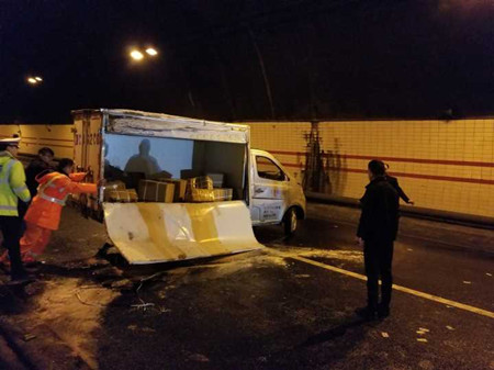 11月30日晚9:46分,中控員陳旦平當班時發(fā)現(xiàn)寧波方向隧道進洞600米處,一輛小貨車側翻橫臥在兩個車道上,導致后方車輛無法前行。他隨即啟動隧道事故處置預案并通知執(zhí)勤隊員前去查看。