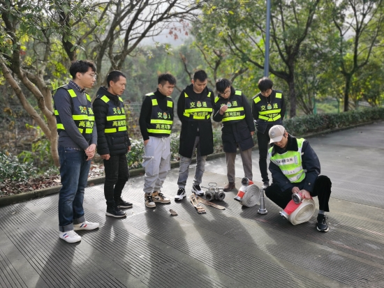 圖為陶文輝在教樂清公司員工如何進行水帶操作 本次培訓對隧道預警流程、二帶連接及執(zhí)勤隊在平時巡邏、預警、處理事故中如何確保自身安全等進行重點講解。執(zhí)勤隊長帶領隊員們在管理所操場進行模擬主線卡口、事故拋錨車預警封道操作,樂清公司員工觀摩之后也進行實際操作,孫鵬詳細講解擺放隔離錐應注意事項,每一隔離錐的間隔位置、巡邏車后方擺放的安全距離,事故處理之后,收隔離錐應注意的安全動作。陶文輝為樂清公司員工演示“二帶連接”,并對水帶的甩、接、收每一動作盡可能詳細仔細地進行解說示范。