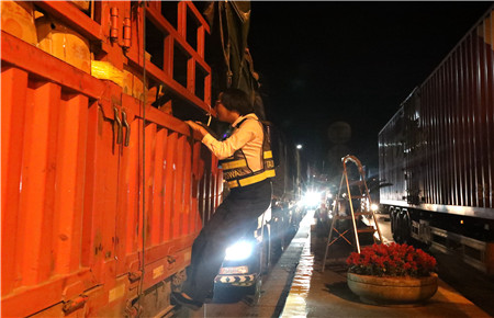 夜間綠農(nóng)車輛多,據(jù)統(tǒng)計,當(dāng)天凌晨早班臨海南收費(fèi)所出口綠農(nóng)車108輛,是平時日均數(shù)量的八九倍。短時間內(nèi)的“井噴式”增長,這又是一個大考驗(yàn)。“三號綠色”、“一號綠色”、“二號綠色”……“來啦!”旁站人員箭步?jīng)_過去拍照取證、檢查車輛。大貨車又高又寬,平時需登專用扶梯進(jìn)行檢查,可在大流量面前保安全省時間是第一要旨,這些個巾幗女將們面對高貨車,一手拉著車把,一腳踩在車杠上,迅速上車開展核查,執(zhí)行速度絲毫不遜于男同志。有時剛從這輛貨車上下來,又立刻奔向了其它車道。晴夜當(dāng)空,車道間一個個忙碌的身影不停穿梭著,卻不言乏力。
