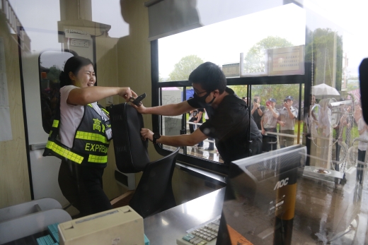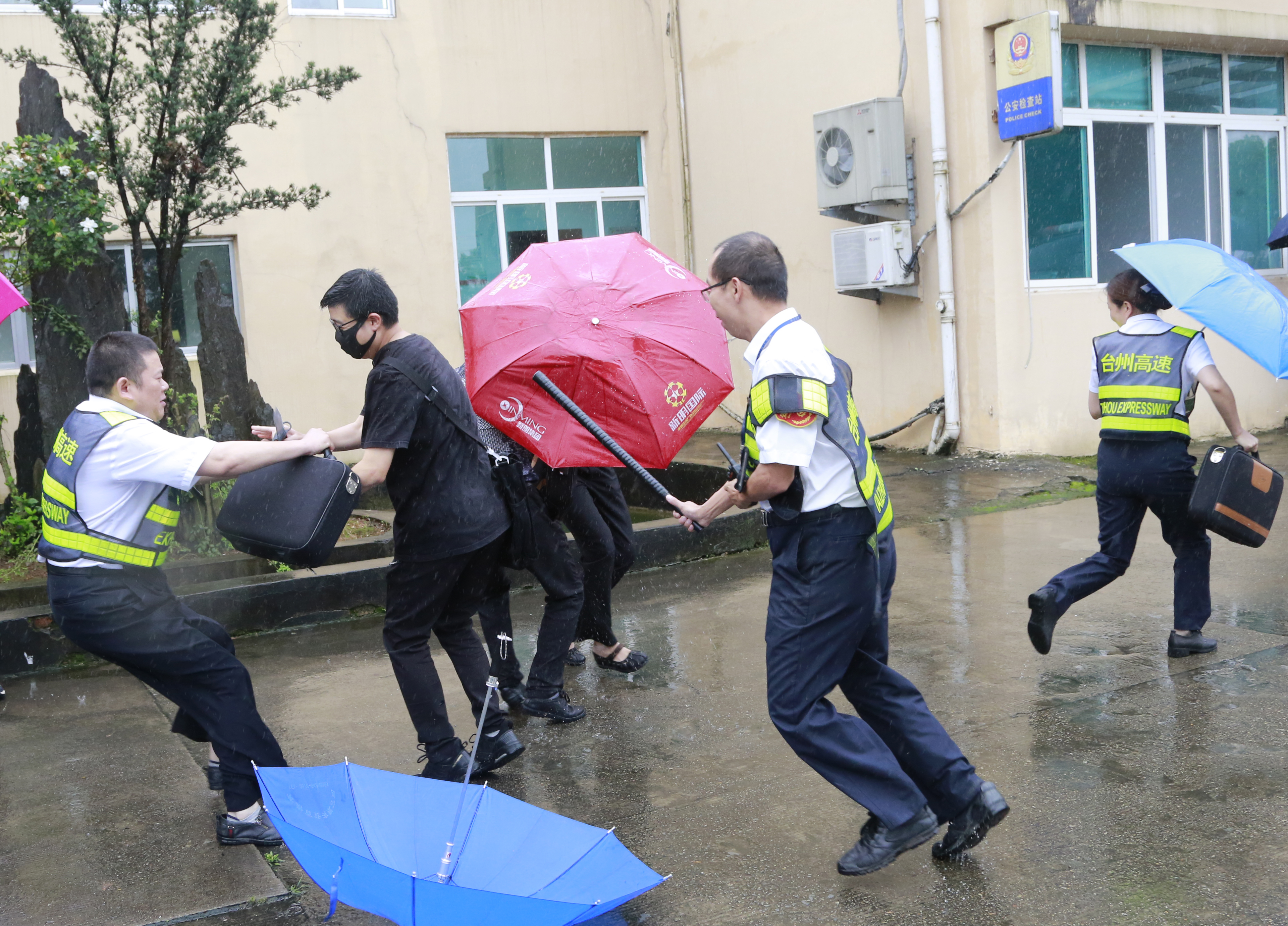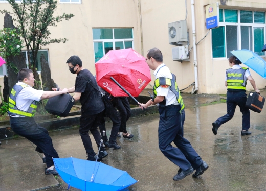 隨后,多名參演員工冒雨模擬收費(fèi)崗?fù)ず土嘘?duì)下崗遭遇“歹徒”搶劫的情景開展防盜搶演練?,F(xiàn)場,2名蒙面歹徒執(zhí)仿真刀、軟棍威脅收費(fèi)員交出現(xiàn)金,危機(jī)之中,收費(fèi)站立即啟動應(yīng)急處置預(yù)案并報(bào)警求助,收費(fèi)員有效與歹徒周旋,應(yīng)急處置組人員迅速攜鋼叉、橡膠棒、勞動工具等赴現(xiàn)場支援,值班領(lǐng)導(dǎo)、收費(fèi)班長、監(jiān)控員合力協(xié)作應(yīng)對歹徒,防盜搶演練順利結(jié)束。
