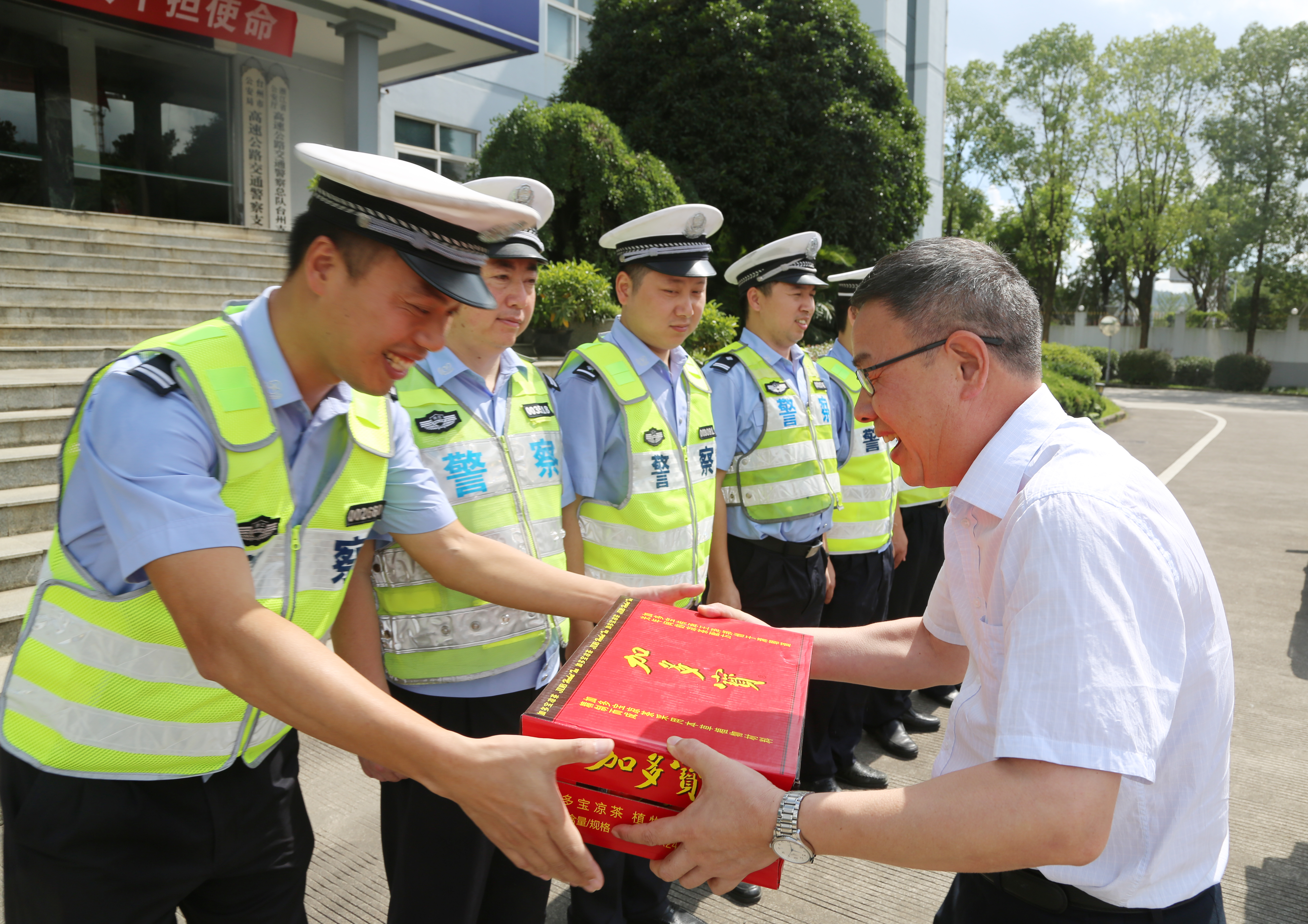 與此同時,集團總工程師江輝帶領(lǐng)工程部及收費所相關(guān)人員到院橋派出所和交警隊開展“送清涼”活動。江輝代表臺州高速集團對當?shù)嘏沙鏊徒痪牭穆穆毐M責(zé)、通力協(xié)作表示衷心感謝,并叮囑他們在高溫天氣要做好防暑降溫工作。