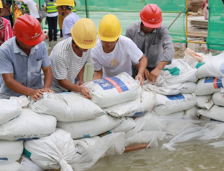 圖為模擬建筑工地面對(duì)洪水倒灌的現(xiàn)場(chǎng)應(yīng)急搶險(xiǎn)