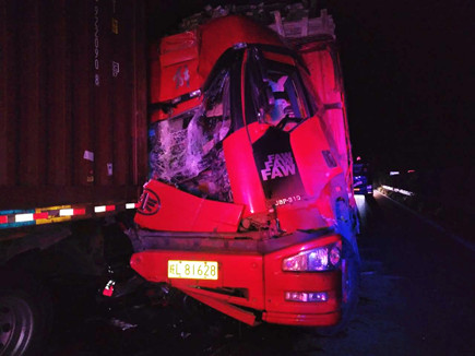 圖為被撞壞的ETC設(shè)備 當(dāng)晚事故接連不斷。晚上22點(diǎn)40分,臺(tái)州收費(fèi)所ETC進(jìn)口處,一輛大客車行李車門(mén)撞歪顯示屏,同時(shí)也撞壞了一只抓拍攝像頭,造成了較大的路產(chǎn)損失,但是當(dāng)班員工都正在路面上施救,施救中心領(lǐng)導(dǎo)統(tǒng)籌部署,通知兩位在所非當(dāng)班人員赴崗上班,緊急出動(dòng),發(fā)揮連續(xù)作戰(zhàn)精神,進(jìn)行及時(shí)處理。 當(dāng)以上事故處理完畢,施救人員正準(zhǔn)備往回趕的時(shí)候,當(dāng)晚23點(diǎn)10分左右,四輛大貨車在寧向1667K+300M處連環(huán)追尾,其中一輛紅色大貨車車頭嚴(yán)重變形并且不斷向外漏油。現(xiàn)場(chǎng)極不安全,情況危急,施救中心員工馬不停蹄,又一次拉響了救援車的警報(bào),為了爭(zhēng)取時(shí)間,甚至通知了另外地點(diǎn)待崗的人員火速趕來(lái),以便能及早處理。此時(shí),施救中心當(dāng)班人員已經(jīng)全體出動(dòng),全部戰(zhàn)斗在路上。 王凱
