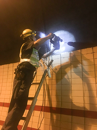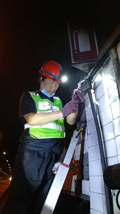 圖為工作人員安裝消防燈燈泡 大溪嶺—湖霧嶺隧道全長(zhǎng)4116米,為保障隧道內(nèi)行車安全、暢通、舒適,定期組織安排清洗隧道兩壁墻體、邊溝,檢修內(nèi)部各項(xiàng)機(jī)電設(shè)施成了維養(yǎng)中心每季必不可少的工作之一。而每次清洗檢修必將涉及封道,為最大程度減少因封道對(duì)社會(huì)造成的負(fù)面影響,中心工作人員早在一周前就對(duì)隧道內(nèi)各項(xiàng)損壞機(jī)電設(shè)備進(jìn)行摸底統(tǒng)計(jì),以便合理制定維修方案和安排施工人員。 12號(hào)早上7點(diǎn),隨著封道工作就緒,兩組清洗隊(duì)伍分別從隧道中部開(kāi)始向兩頭清洗,六組專業(yè)燈具維修人員站在貨車腳手架上由北往南逐個(gè)推進(jìn),發(fā)現(xiàn)一盞修復(fù)一盞,或更換燈管、或更換觸發(fā)器、或更換鎮(zhèn)流器,對(duì)于一些同時(shí)有多個(gè)配件壞死或腐蝕嚴(yán)重的燈具就直接采取整體更換措施,大大提高了工作效率。而中心工作人員除了現(xiàn)場(chǎng)全程協(xié)調(diào)管理以外,還負(fù)責(zé)修復(fù)隧道兩壁逃生標(biāo)志及報(bào)警電話等多個(gè)指示牌。按照之前制定的計(jì)劃,六人兵分兩組由隧道兩頭分別向中間修復(fù),這樣既能與其他工作同時(shí)進(jìn)行又不造成相互干擾。另外一人則配合隧道所一起在登高車協(xié)助下,對(duì)洞內(nèi)各類攝像頭進(jìn)行逐個(gè)清理,全場(chǎng)人員各司其職,各盡其責(zé),現(xiàn)場(chǎng)一派忙碌的景象。 4公里多長(zhǎng)的隧道,由于流動(dòng)性差,洞內(nèi)空氣質(zhì)量比霧霾嚴(yán)重?cái)?shù)倍,僅一只口罩根本凈化不了廢氣,但由于時(shí)間緊,任務(wù)重,中心隊(duì)員和施工人員顧不上惡劣的環(huán)境,努力和時(shí)間賽跑,兩日下來(lái)共修復(fù)(清理)損壞燈具100余套,各類標(biāo)志指示牌40余塊,攝像頭30余個(gè),恢復(fù)了隧道內(nèi)各項(xiàng)機(jī)電設(shè)施的正常運(yùn)行,排除一切安全隱患,有效保證了隧道安全暢通。 項(xiàng)寅曉