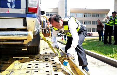 當(dāng)哨聲響起時(shí),清障作業(yè)的考試開始了。就象聽到路上事故的指令,選手們飛快躍上清障車,趕到“現(xiàn)場(chǎng)”,一組兩名員工,一名快速擺放隔離筒進(jìn)行預(yù)警,一名趕到“事故車”前進(jìn)行背拖拖曳作業(yè),綁帶作業(yè)、固定輪胎,甚至警燈、檔位、手剎、安全帶、巡視事故車等細(xì)節(jié)也有具體要求,雖然上午天氣涼爽,可因?yàn)楸荣惖乃俣缺绕磁c現(xiàn)場(chǎng)緊張的氣氛,選手們額頭都冒出了熱氣。