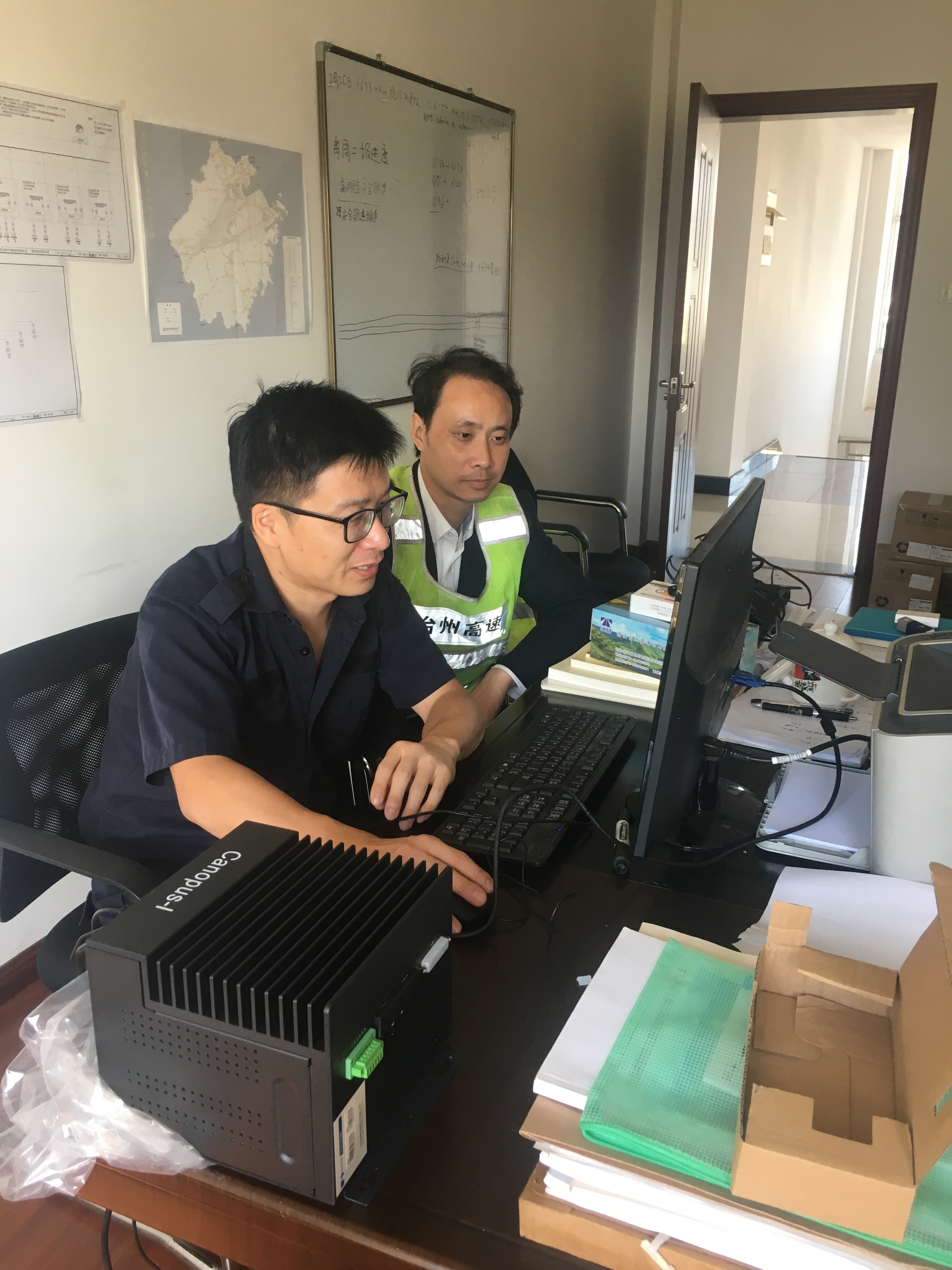 集團(tuán)取消省界收費(fèi)站工作已取得階段性進(jìn)展 10月15日,臺州收費(fèi)所一樓大廳及工程部機(jī)電設(shè)備維養(yǎng)中心辦公室一片忙碌,各種為取消省界收費(fèi)站服役的車道工控機(jī)及路面圖片存儲處理器一字排開,中心系統(tǒng)員全力協(xié)助廠方人員安裝各種程序及軟件,不到一天時間便將所有到位的24臺機(jī)器安裝完畢,不日將投入到各收費(fèi)站和路面門架監(jiān)測點(diǎn)。