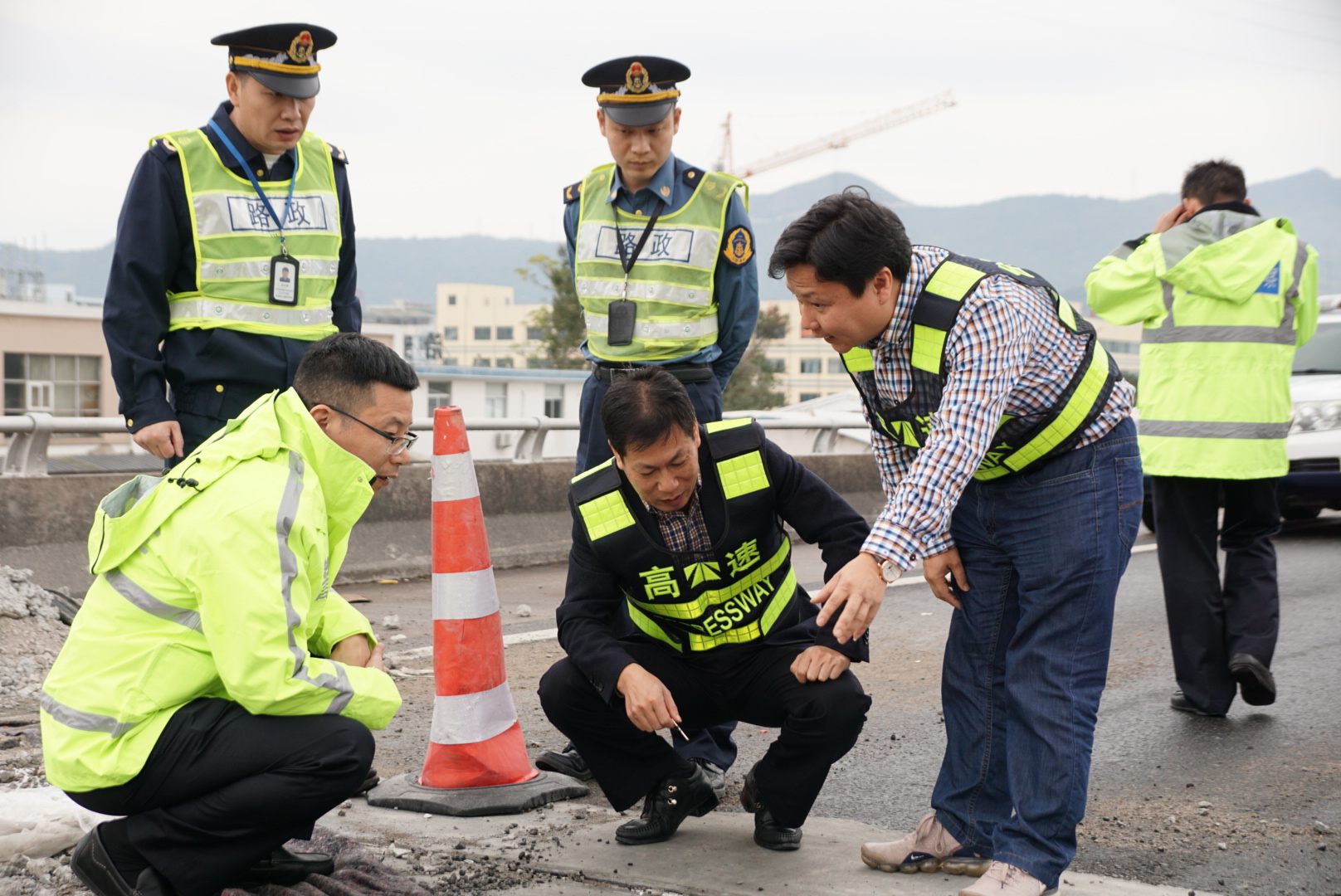 檢查組現(xiàn)場(chǎng)勘查 在各交通管控點(diǎn)、分流點(diǎn),檢查組對(duì)一直24小時(shí)堅(jiān)守在崗位上的工作人員表示慰問(wèn),并希望他們能繼續(xù)保持昂揚(yáng)的斗志,直到完成這項(xiàng)重點(diǎn)工程。
