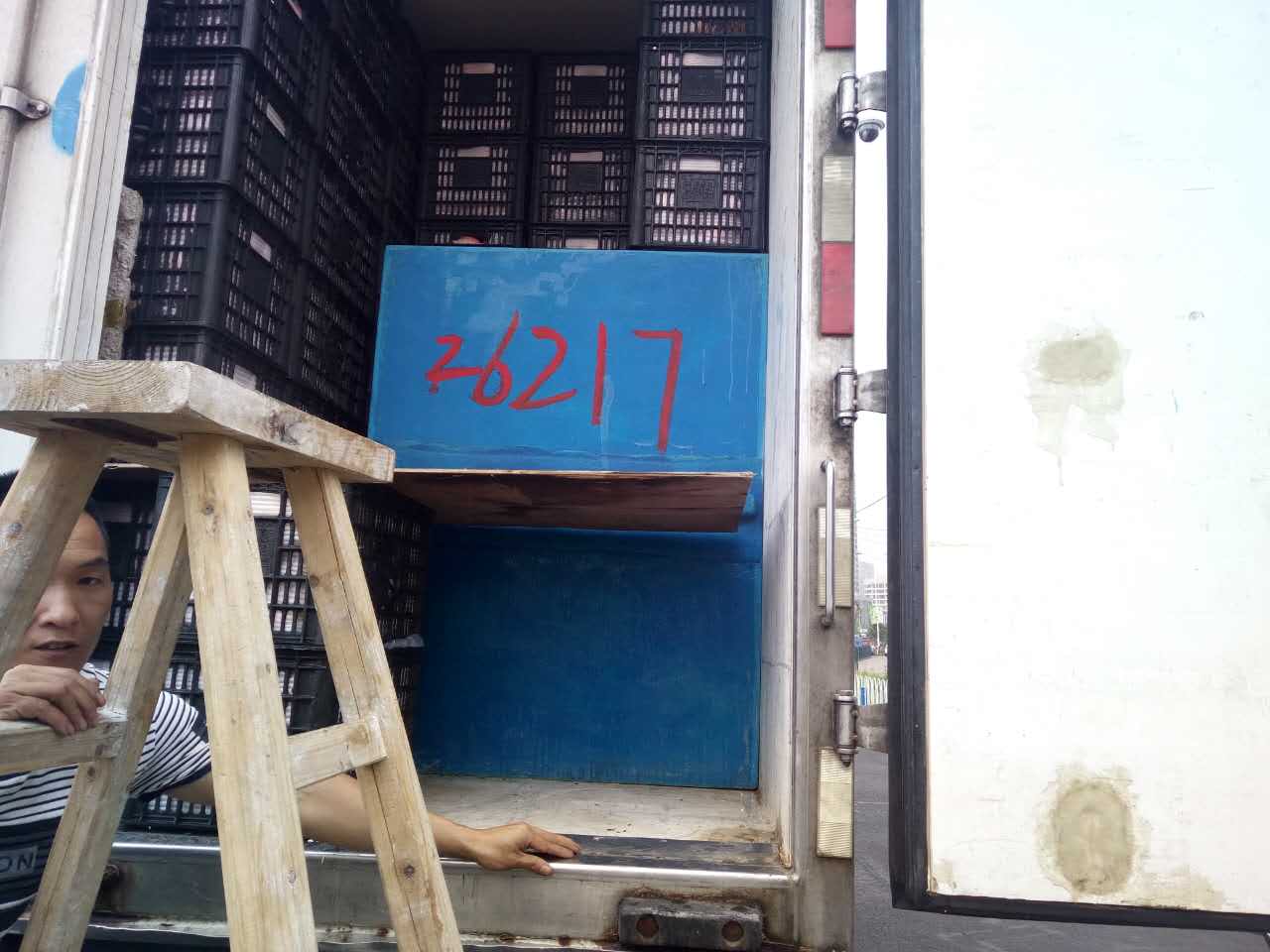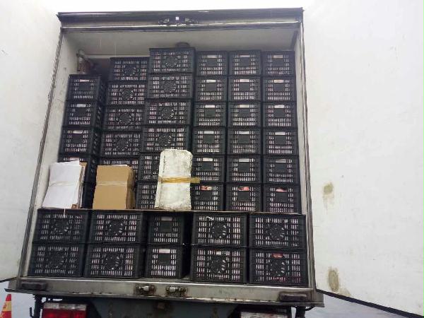 圖為被處罰的車輛 早上10點(diǎn)40分左右,這輛運(yùn)蘋果的貨車駛?cè)胧召M(fèi)站的一號(hào)崗?fù)?,司機(jī)師傅說自己運(yùn)的是蘋果,根據(jù)公司規(guī)定,綠農(nóng)車檢查必須開車門檢查貨物。憑著多年的檢查經(jīng)驗(yàn),當(dāng)班班長(zhǎng)童軍偉發(fā)現(xiàn)這輛綠農(nóng)車有問題,覺得重量遠(yuǎn)遠(yuǎn)不夠,可能不符合“綠農(nóng)”免費(fèi)政策。果不其然,車廂中“深藏玄機(jī)”,左右兩側(cè)各有一排玻璃鋼魚箱,這就給檢查增加了難度。當(dāng)班班長(zhǎng)要求司機(jī)師傅把最后兩排箱子拿掉,想檢查玻璃魚缸,然而這個(gè)司機(jī)極其不配合,還惡意刁難工作人員,說什么也不搬蘋果。