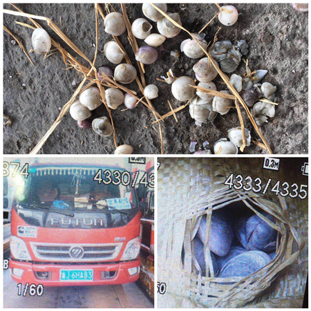 11月2日上午10:39分左右,車牌為浙J6HA83的小貨車駛?cè)霚貛X西收費所2號崗亭,該車駕駛員稱自己運載的貨物為綠農(nóng)產(chǎn)品,要求免費,堵塞車道一個多小時。最后在取證報警下,駕駛員交付通行費320元。 該車被篷布包著,車上貨物又被袋子緊緊包著。當工作人員要求檢查取證時,駕駛員只摳開指定的袋子,并且口子開得非常小,只讓人隱約看到貨物是貝殼。工作人員按規(guī)定要求駕駛員打開另一處取證,駕駛員以貨物被繩子綁著不好打開為由,只在前端把袋子摳了一個比硬幣大點的小洞,拿出幾個貝殼,工作人員看到其拿出的貝殼不管是在大小還是顏色上,都和他剛才指定的那袋貨物有明顯區(qū)別,于是工作人員親自用手摸進去查驗,經(jīng)仔細檢查,貨物屬于貝殼中的殘次品,懷疑是飼料用途。
