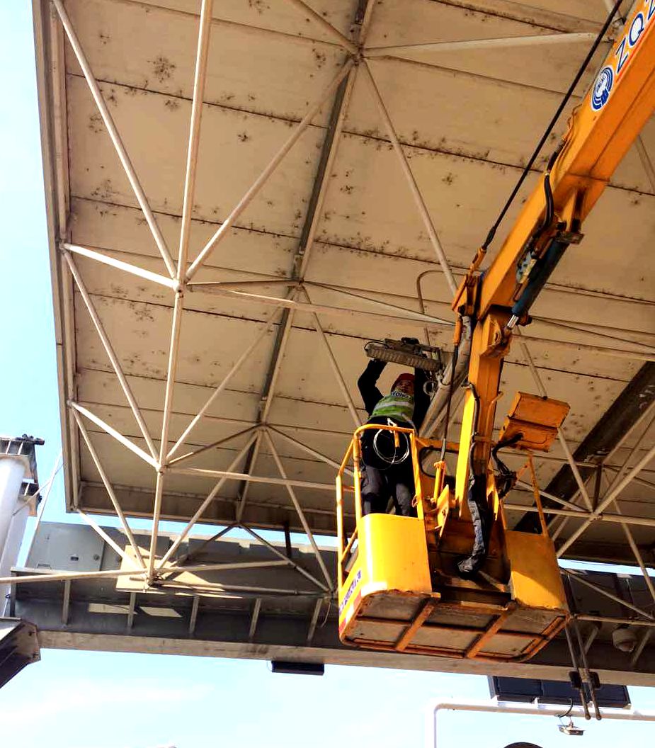 圖為隊(duì)員正在更換車道頂棚燈 期間在臺(tái)州南收費(fèi)所發(fā)現(xiàn)有兩個(gè)車道出現(xiàn)異常,即當(dāng)重型車輛通過時(shí),輪檢鐵板和稱臺(tái)出現(xiàn)不正?;蝿?dòng)情況。根據(jù)以往經(jīng)驗(yàn),此情況如不進(jìn)行及時(shí)維修,對車輛計(jì)重將造成嚴(yán)重影響。對此,技術(shù)人員不僅對鐵板上每顆螺栓都進(jìn)行了認(rèn)真細(xì)致的重新加固,之后不厭其煩對每個(gè)稱臺(tái)限位都進(jìn)行了多次調(diào)整,直至將晃動(dòng)幅度控制在正常范圍內(nèi)。