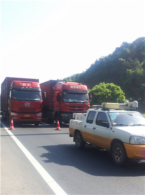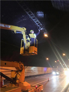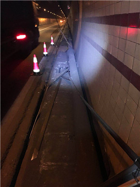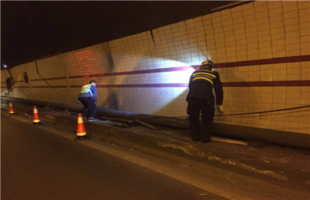 此時此刻,維養(yǎng)中心值班同志已經(jīng)馬不停蹄地奔往現(xiàn)場,中心負責人從臨海速度趕往現(xiàn)場。經(jīng)檢查,掛落電纜系汽通門控制線,不影響隧道內(nèi)照明、通訊系統(tǒng)的正常運行。當機立斷,決定采取臨時加固的緊急措施,及時聯(lián)系協(xié)調(diào)交警部門,請求封道施工的幫助和支持。