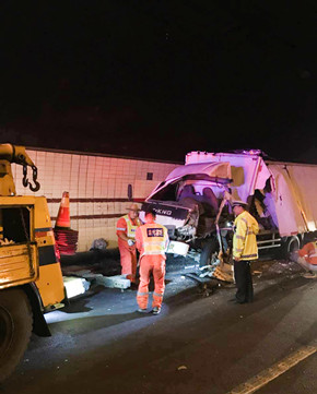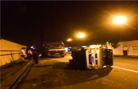 這輛“始作俑者”的車輛由于司機疲勞駕駛,不慎撞擊隧道壁而引發(fā)側翻,雖然該車內無人員受傷,可是跟隨其后的拖掛車就沒那么幸運。拖掛車司機看到前方出狀況,當即采取緊急制動,剎得太急又致使后方小貨車追尾,導致該車車頭嚴重受損,司機的手臂受了傷,運輸?shù)匿X塊也撒了一地。