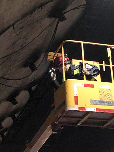 圖為各方人員集聚商討搶修方案 黃土嶺隧道所立即啟動應急搶修預案,聯合高速交警、工程養(yǎng)護部、施救中心展開緊急搶修工作。現場,各方人員集聚商討搶修方案、檢查安全措施、布置搶修作業(yè)。登高車上,黃土嶺隧道所執(zhí)勤二隊隊長林朝波等一批搶修人員率先清理斷落的電纜,調整接線、緊固螺栓……各項工作環(huán)環(huán)緊扣,緊張而有序。