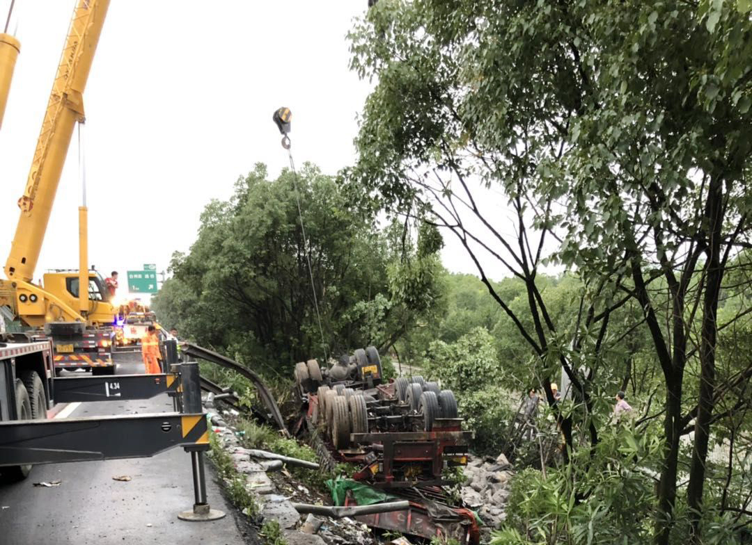 7月14日凌晨1點(diǎn),溫州方向臺(tái)州南收費(fèi)所附近,一輛半掛型大貨車和一輛快遞車相撞,半掛車直接沖出高速,四腳朝天??爝f車則是被巨大的沖擊力撞向了硬路肩,側(cè)翻中撒下數(shù)十米的貨物。1點(diǎn)10分,救援車輛到達(dá)現(xiàn)場(chǎng),現(xiàn)場(chǎng)一片狼藉,防撞護(hù)欄板、護(hù)欄柱損傷嚴(yán)重,橋梁鋼管都折斷了不少。