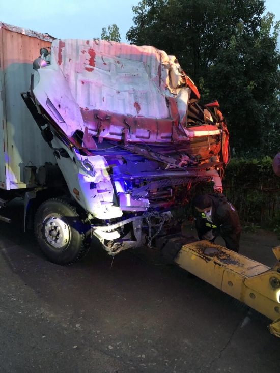 7點(diǎn)30分,經(jīng)過半小時(shí)的努力,在輔查員在一旁指揮下,拖車用纜繩進(jìn)行牽引,吊車配合,將車頭放置可以正常拖曳的地方。