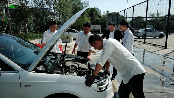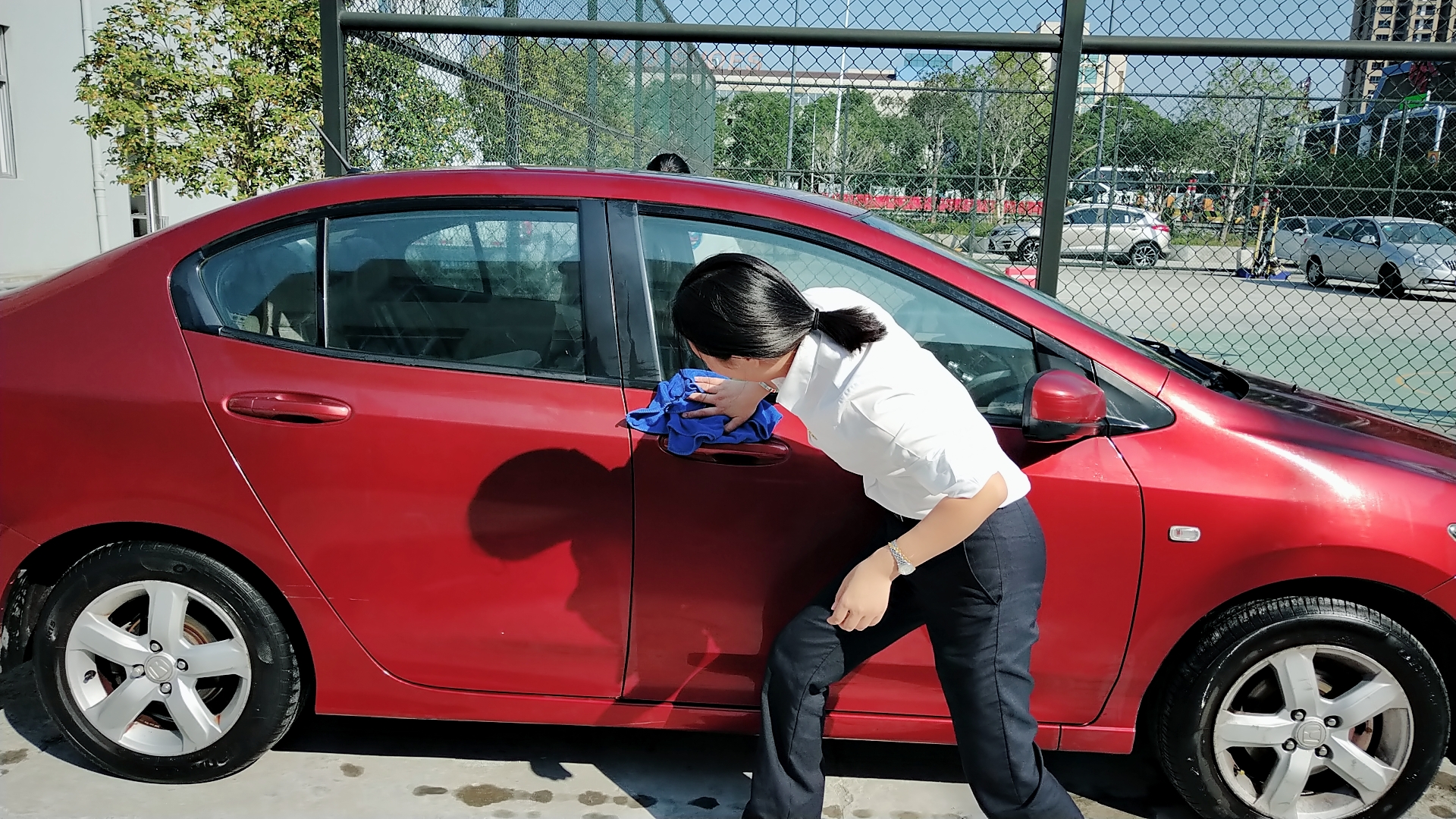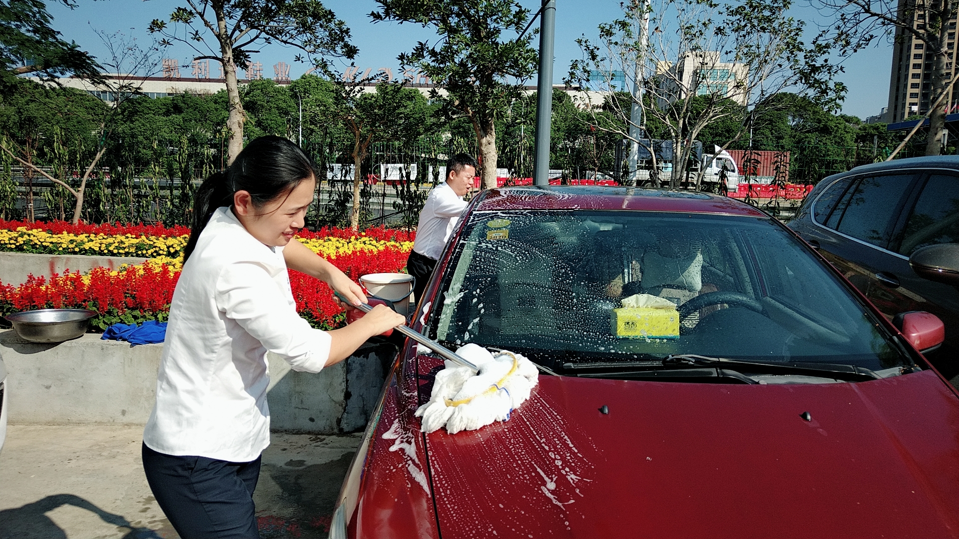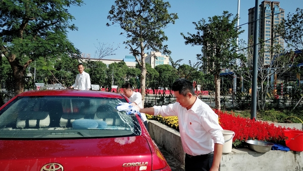 當(dāng)天上午,活動(dòng)一開始,前來洗車的車輛絡(luò)繹不絕。在支部書記周超的帶領(lǐng)下,五名黨員便開始分工合作。兩名男同志負(fù)責(zé)沖水、上泡沫、擦洗、再?zèng)_水,兩名女同志負(fù)責(zé)擦干和吸塵器清掃內(nèi)室,還有一名男同志負(fù)責(zé)開車挪車,需要清洗的車輛一輛接著一輛,黨員同志們顧不得擦干身上的被水濺濕了的衣服,忙得不亦樂乎??粗幌吹靡粔m不染的車,大家都不約而同地會(huì)心一笑。