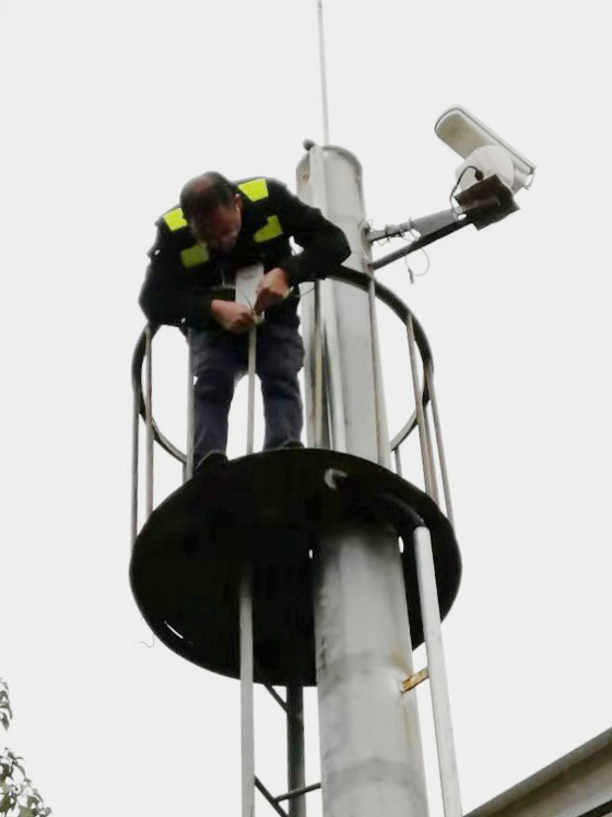 圖為搶修人員在安裝無線網(wǎng)橋 面對難題,中心隊員并沒有退縮,而是積極面對、集思廣義,想到了利用無線網(wǎng)橋點對點的橋接通迅功能,將斷點處的攝像機視頻信號通過網(wǎng)橋無線連接,傳輸?shù)脚R近攝像機光端機上,隨后再一起將信號傳輸?shù)奖O(jiān)控中心,實現(xiàn)網(wǎng)絡(luò)和通迅共享的解決方案。這既可以避免因封道施工造成車輛擁堵,又可以為公司節(jié)省近萬元維修費用。然而在實際操作中,還要解決另外一個棘手的問題,就是無線網(wǎng)橋供電電流和電壓無法直接從攝像機電瓶中獲取,但這些同樣難不到中心隊員們,他們又想到了之前路面拆卸下來逆變器,利用它的逆變原理成功解決網(wǎng)橋供電問題。 說降就降的氣溫,加上路面飛馳而過的車輛帶來的陣陣寒風,吹得隊員瑟瑟發(fā)抖。但他們都知道要是晚一天修復網(wǎng)絡(luò),路面就會多一份隱患。在中心負責人的帶領(lǐng)下,搶修人員按照之前設(shè)定的方案,一人負責云臺上面的無線網(wǎng)橋安裝,另外兩人負責地面逆變器及網(wǎng)絡(luò)的安裝。由于大家分工明確、配合默契,不到半天時間,路面兩處斷點視頻信息再次出現(xiàn)在了監(jiān)控中心的大屏上。 項寅曉
