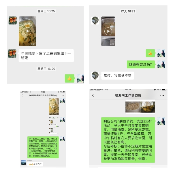 臨海南收費(fèi)所不只是單單把宣傳標(biāo)語掛在墻上,擺在桌上。更把節(jié)約舉措落實(shí)到具體行動(dòng)中。為了不浪費(fèi)食材,行政人員提前安排一周菜單,并統(tǒng)計(jì)用餐人數(shù),規(guī)劃食材數(shù)量,食堂工作人員按照人數(shù)采購當(dāng)天食材控制成本,并將每餐燒好的菜拍成視頻上傳食堂交流群,以更好地關(guān)注食堂動(dòng)態(tài),從源頭把控菜量與伙食的品質(zhì),每周還不定期抽查食堂,查看剩余量。
