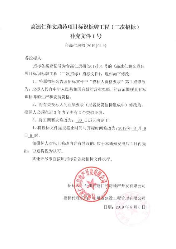 高速仁和文鼎苑項(xiàng)目標(biāo)識標(biāo)牌工程(二次招標(biāo))補(bǔ)充文件1號