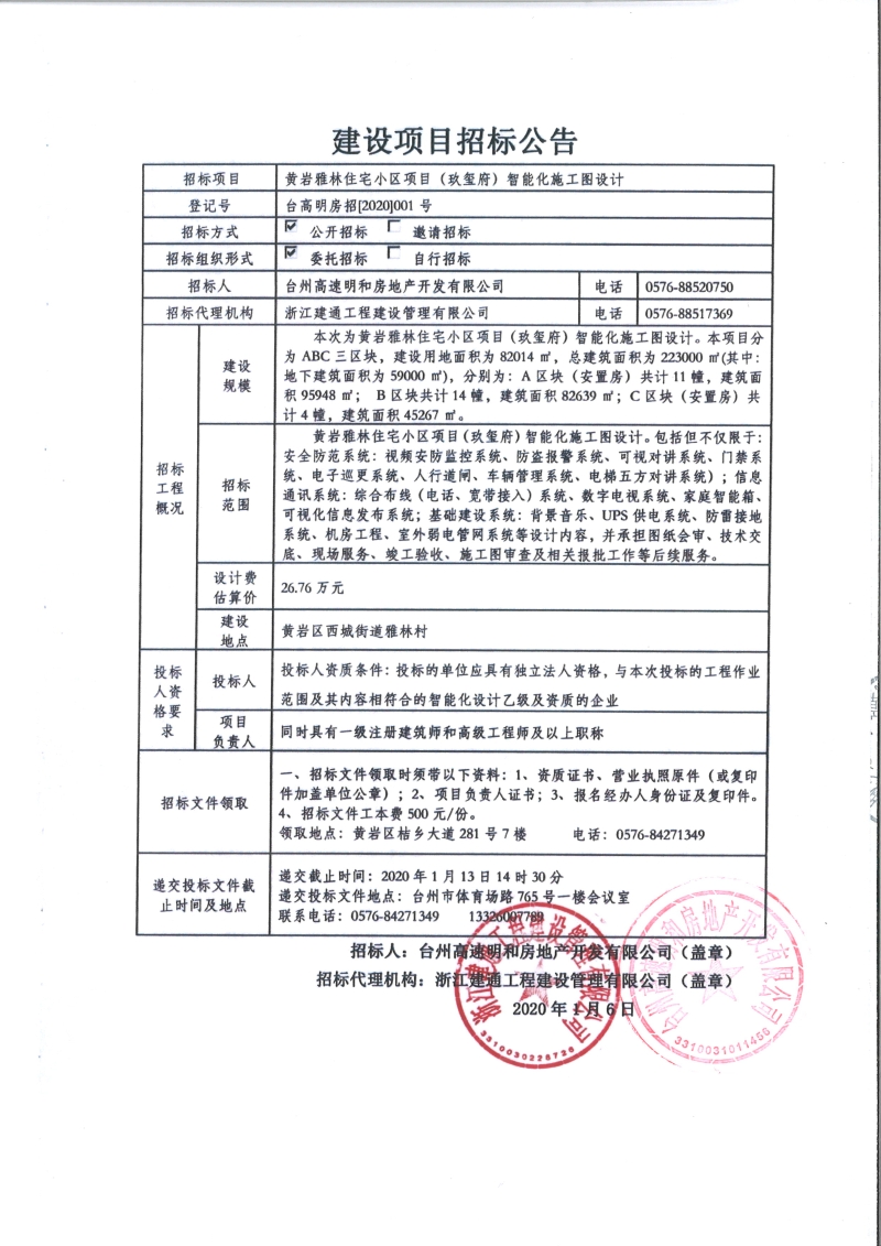 黃巖雅林住宅小區(qū)項目(玖璽府)智能化施工圖設(shè)計招標公告