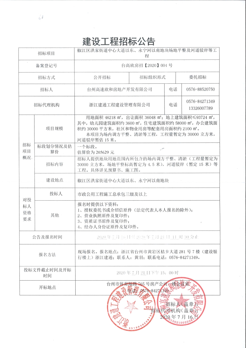 椒江區(qū)洪家街道中心大道以東、永寧河以南地塊場地平整及河道駁岸等工程招標公告