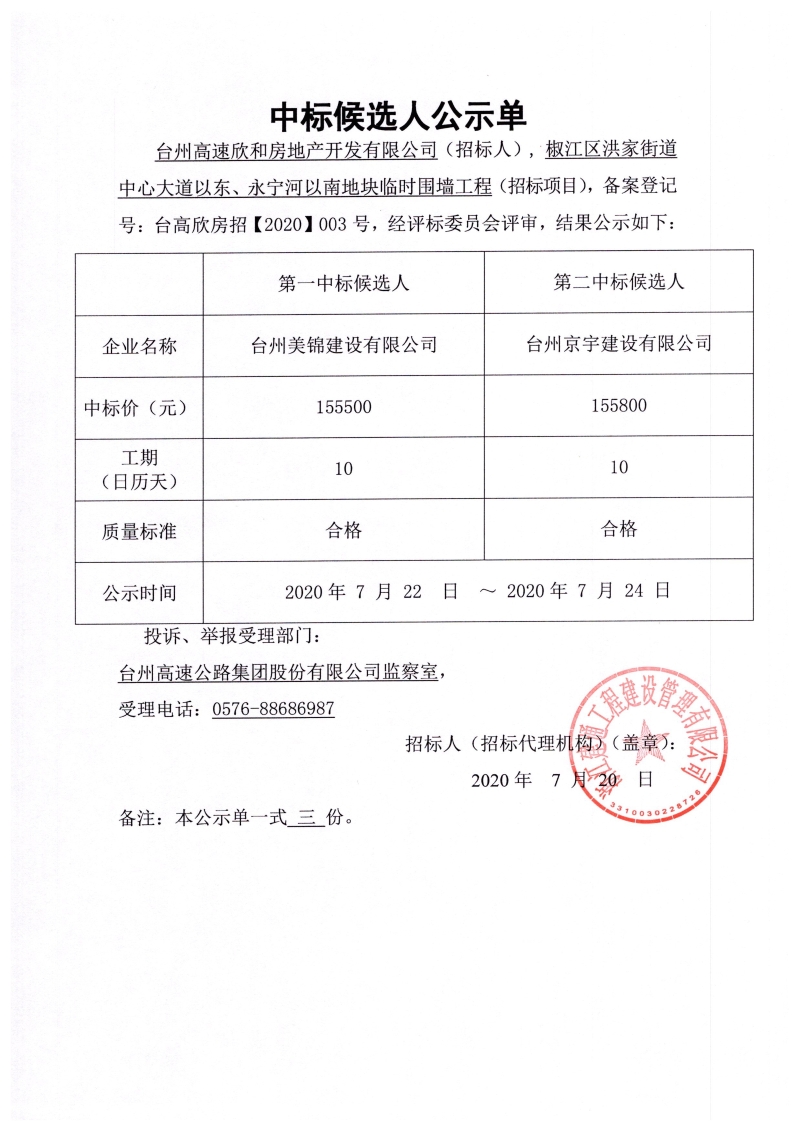 椒江區(qū)洪家街道中心大道以東、永寧河以南地塊臨時(shí)圍墻工程(招標(biāo)項(xiàng)目)中標(biāo)候選人公示單