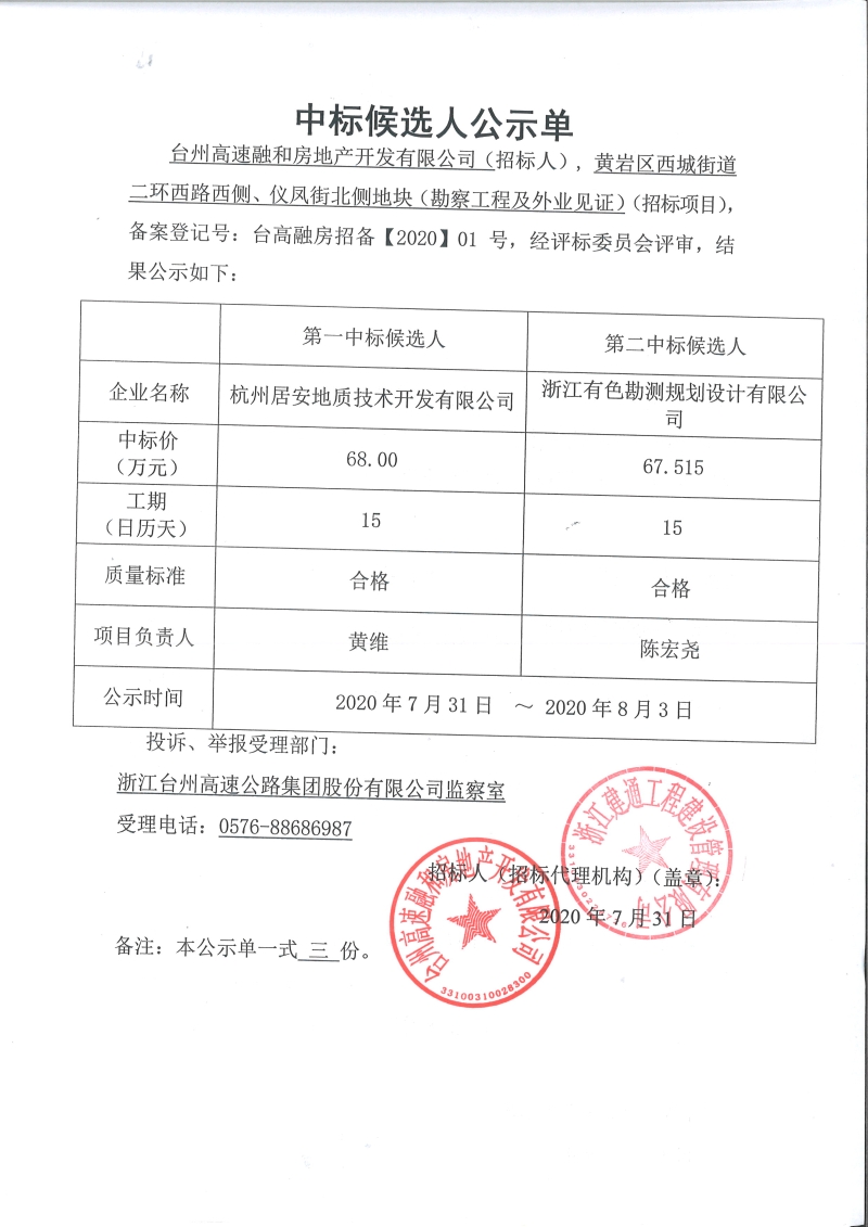 黃巖區(qū)西城街道二環(huán)西路西側(cè)、儀鳳街北側(cè)地塊(勘察工程及外業(yè)見(jiàn)證)中標(biāo)候選人公示單