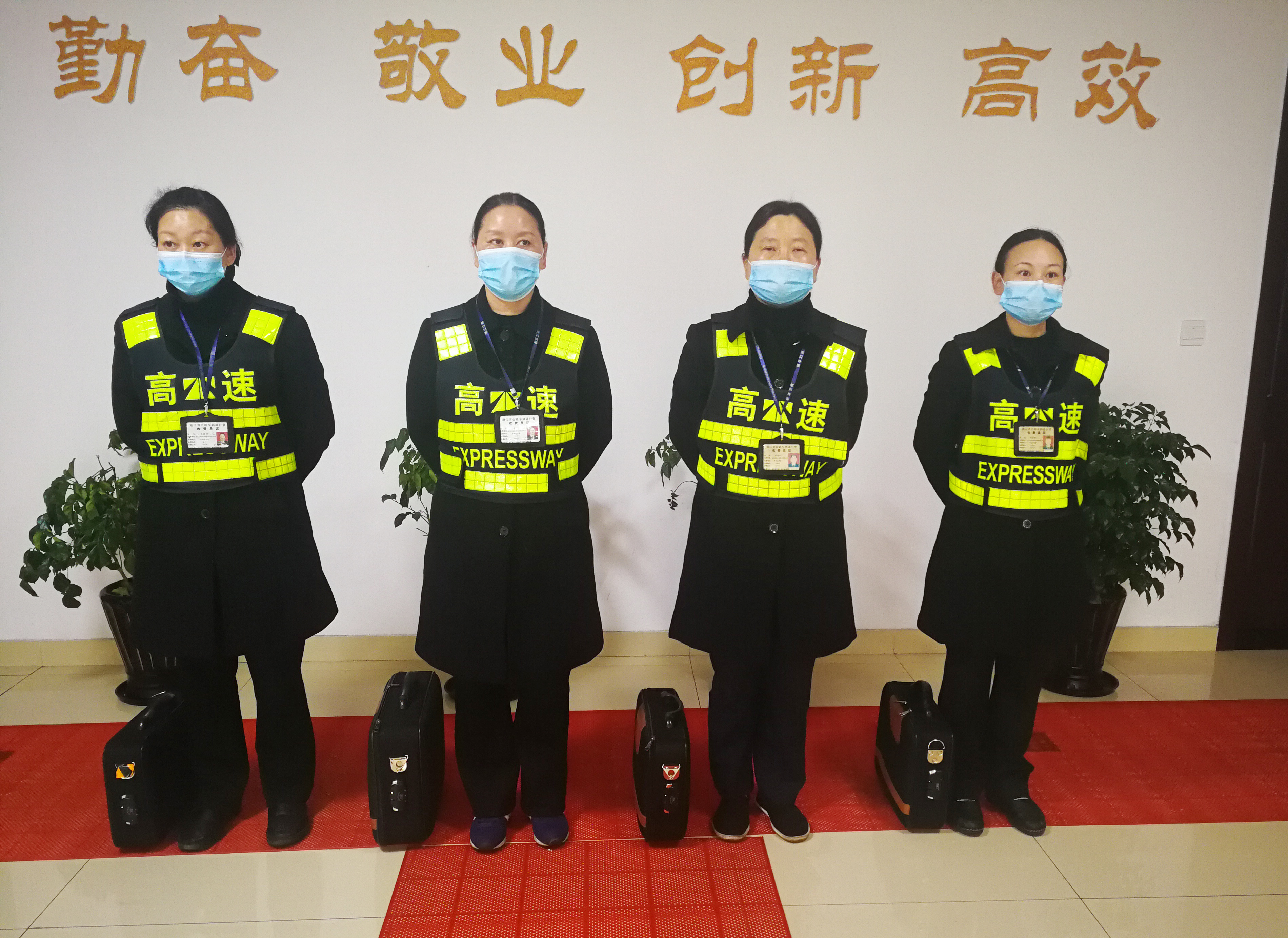 3月8日早上8點(diǎn)不到,孩子還未滿周歲的收費(fèi)員李菊麗穿好工作服,戴上口罩,在臨海南收費(fèi)所大廳和其他同事一起列隊(duì)等待上崗。這一班換崗恰巧全部輪到女同事,“今天是三八婦女節(jié),今天的崗?fù)と晃覀兣?,大家一起來做好防疫工作,站好崗!過好節(jié)?!崩罹整愅?duì)友說道。