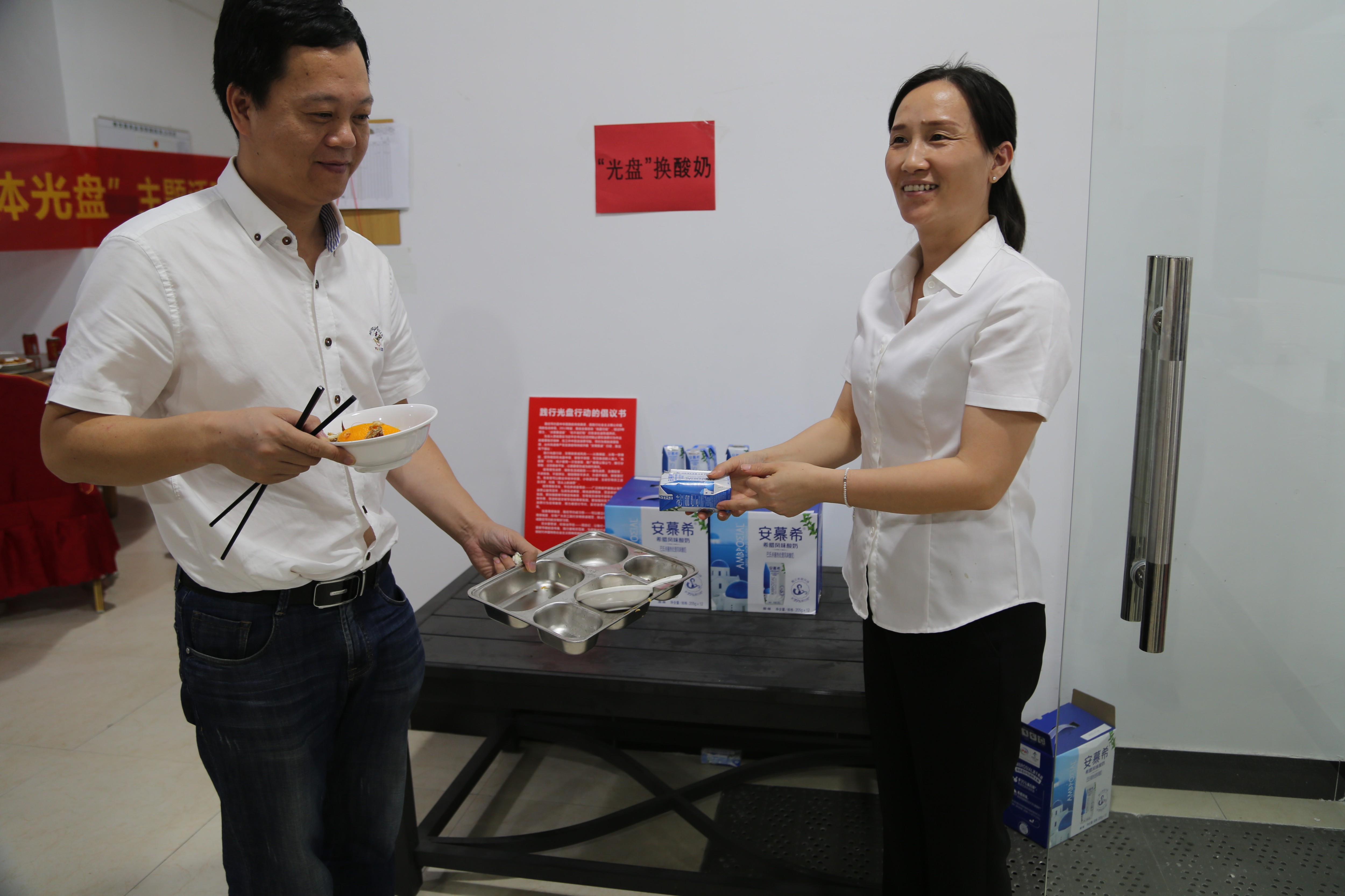 餐后,公司為倡導(dǎo)員工愛(ài)惜糧食,鼓勵(lì)員工積極光盤,實(shí)行“光盤獎(jiǎng)勵(lì)”,每一位員工憑光盤可以兌換酸奶一瓶,借此小獎(jiǎng)勵(lì),倡導(dǎo)文明新風(fēng)尚,以“光盤”為榮,以“剩宴”為恥。 盧丹麗