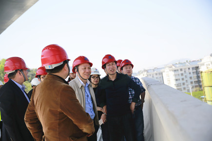 圖為公司總經(jīng)理張建平在8#立交橋上了解相關(guān)工程情況 張建平一行首先實(shí)地查看了內(nèi)環(huán)北路(江口段)項(xiàng)目工地,聽取工程進(jìn)展情況匯報(bào)。在現(xiàn)場(chǎng),只見爆破量達(dá)到70%的安然山體已經(jīng)開辟出一條可供工程車輛通行的大口子,耳邊不停地傳來機(jī)器忙碌作業(yè)的轟鳴聲。張建平一路由東向西穿行在施工便道上,看到施工區(qū)域一側(cè)各種安全防范設(shè)施有序排列,感受到沿途濃烈的施工氛圍,他對(duì)此表示滿意。 途徑內(nèi)環(huán)路8#立交項(xiàng)目工地時(shí),張建平沿著臨時(shí)搭設(shè)的通道,爬上8#立交橋,遠(yuǎn)眺8#立交放射線項(xiàng)目所在地,向有關(guān)人員了解該項(xiàng)目前期準(zhǔn)備工作情況。眼下,距離11月11日內(nèi)環(huán)路主線通車僅剩下近半年的時(shí)間,張建平強(qiáng)調(diào),各部門要努力抓好施工進(jìn)度,保證工程質(zhì)量,更要時(shí)刻將安全放在首位。 陳林偉