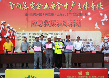 集團(tuán)總工程師江輝,安全總監(jiān)項(xiàng)同富,騰達(dá)建設(shè)集團(tuán)總經(jīng)理?xiàng)罹湃绯鱿顒?dòng),黃巖東區(qū)、南區(qū)建設(shè)指揮部相關(guān)人員,內(nèi)環(huán)路(黃巖段)工程施工單位項(xiàng)目領(lǐng)導(dǎo)、專職安全員,市政公司全體員工參加活動(dòng)。
