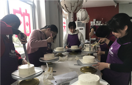 “大膽地將奶油抹開,刀頭45度推開奶油,將蛋糕胚鋪滿……”烘焙老師耐心熟練地邊做示范,邊告訴大家制作要領,“注意手握刀的姿勢,涂側面刀要豎直!”